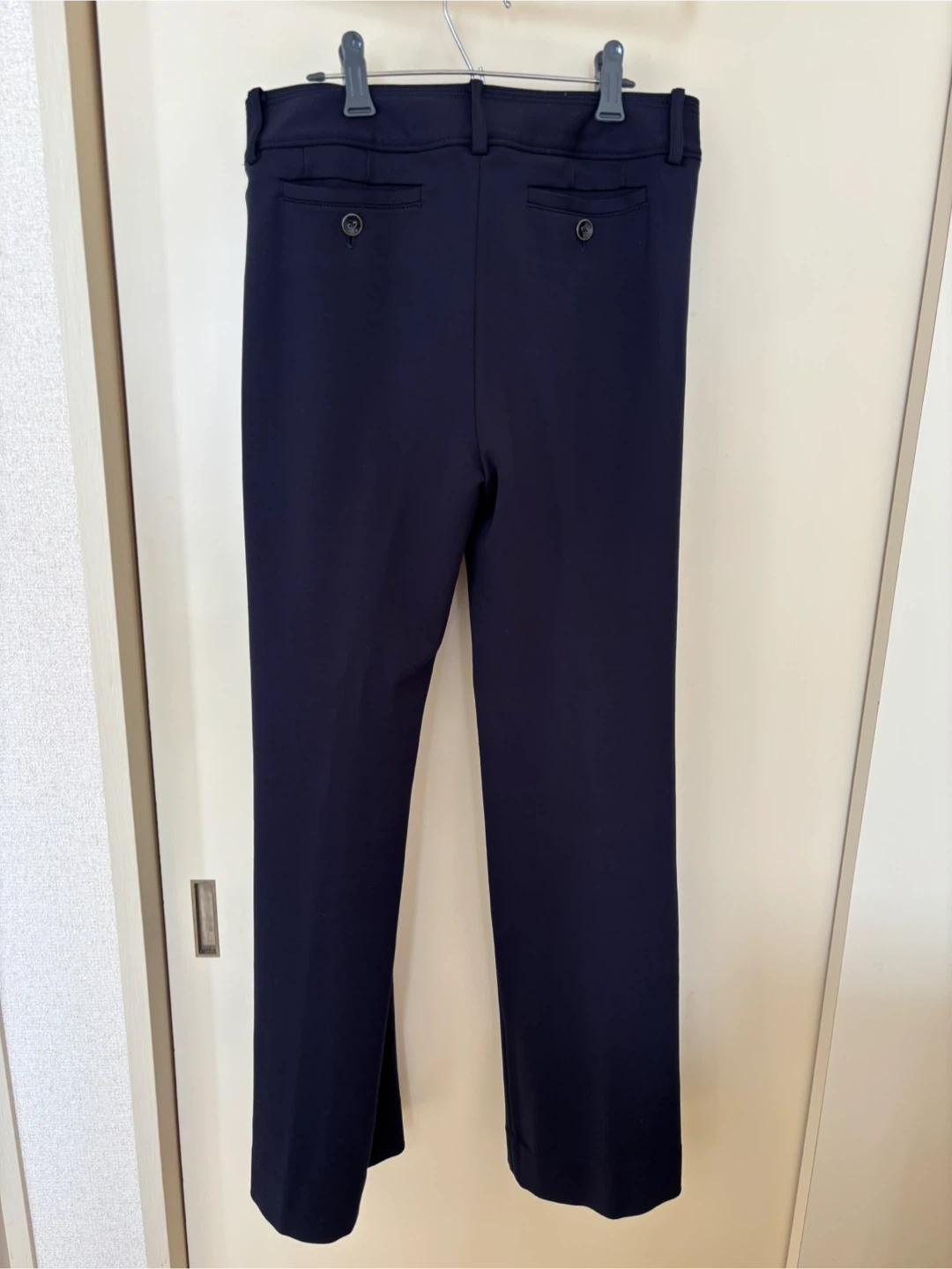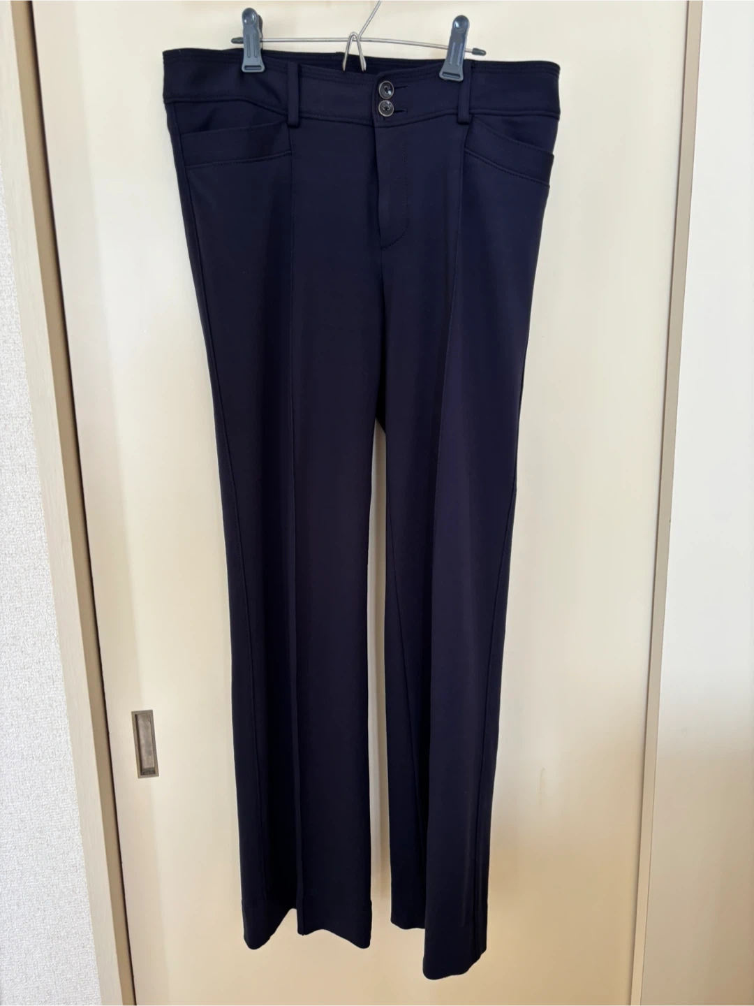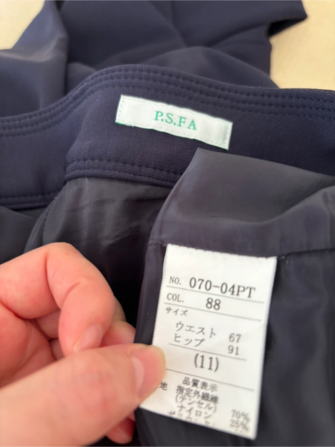 パーフェクトスーツファクトリーのパンツです。 ・ウエスト:67cm ・ヒップ:91cm ・色:ネイビー ・サイズ:11 ・素材:テンセル70%、ナイロン25% ネイビーのスラックス、2つボタン、4つポケット付き。 裾まで裏地付き シワにならない厚手の生地です。 - 色: ネイビー - スタイル: スラックス - ボタンの数: 2つ - ポケットの数: 4つ ボタン部分生地の変色が見られますが、ボタンを閉めると隠れます。写真を参照ください。