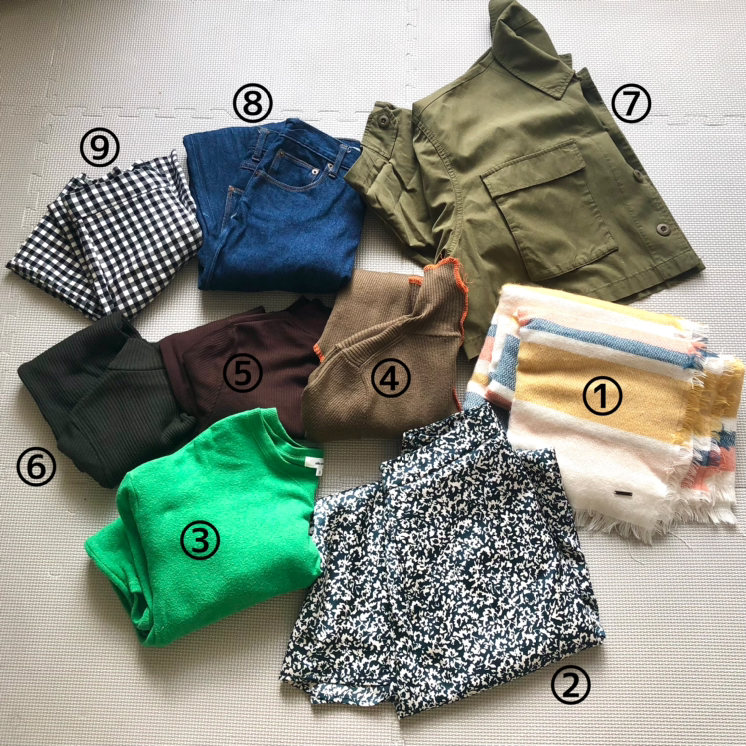 レディース物の衣類 《物、ブランド、サイズ》 ①マフラー、Roxy、Free ②ロングスカート、grobal work、M ③長袖、Niko and、S ④タートルネック、CIAOPANIC TYPY、Free ⑤タートルネック長袖、UNIQULO、S ⑥タートルネック長袖、UNIQULO、S ⑦薄手の上着、CIAOPANIC TYPY、Free ⑧ジーパン、Niko and、XS ⑨パンツ、ZARA、XS