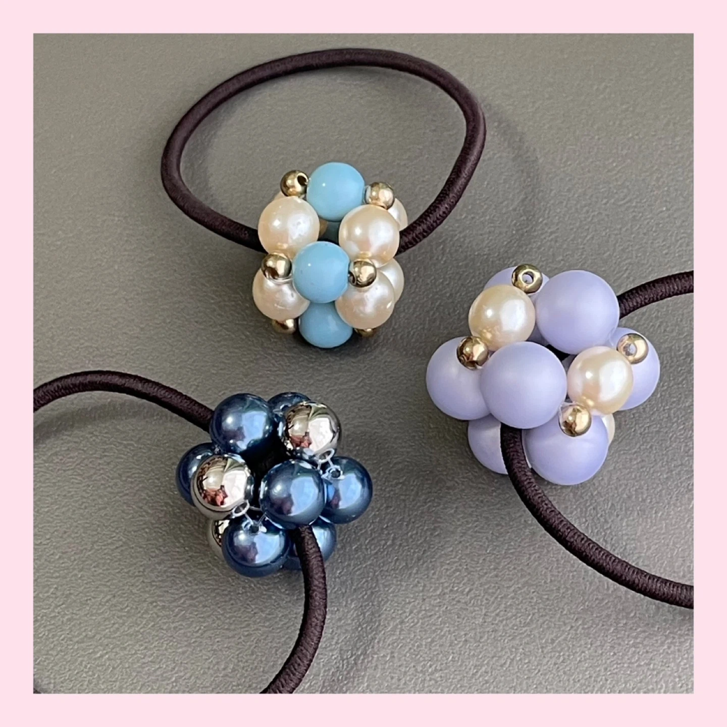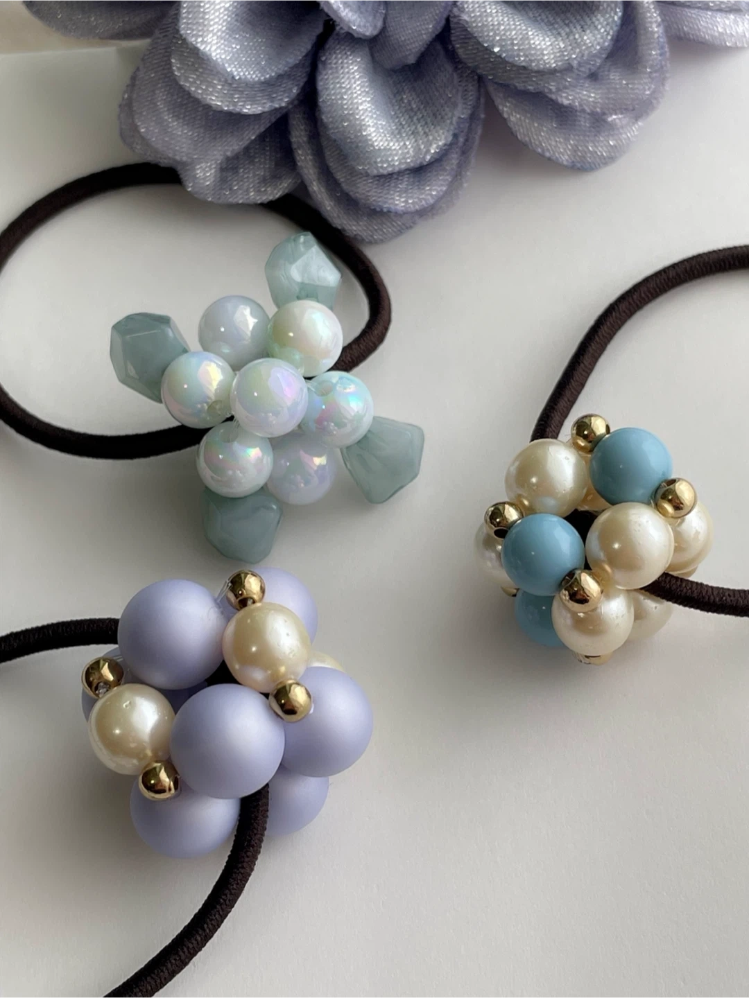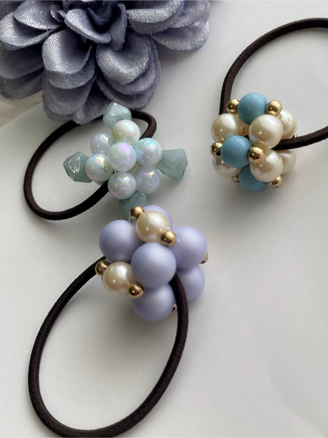 あたたかさレディースヘアゴム3点セットです。 ・色:水色、紫、紺色のビーズ ・デザイン:ビーズで花のような形 ・状態:新品 ・ハンドメイド