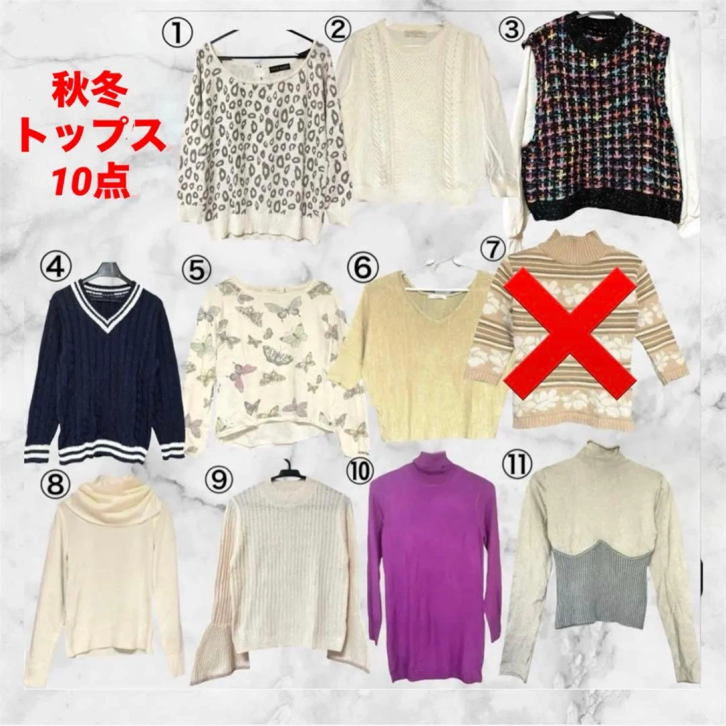 レディース 秋冬トップス セーター ニット 10点まとめ売り ☆レディース ☆バラ売り可能 ① CECIL McBEE セーター ☆素材···ニット ☆ヒョウ柄 ☆サイズ…M 肩幅···50cm 身幅···48cm 袖丈···46cm 着丈···54cm ¥1299 ② BEAUTY&YOUTH UNITED ARROWS セーター ☆伸縮性あり ☆ホワイト ☆サイズ 肩幅…40 袖丈…48 身幅…53 着丈…50 ¥3499 ③ 袖切り替えセーター ニット 毛糸 ☆美品(1、2度着用のみ) ☆サイズ 総丈53 身幅50 ☆伸縮性あり ¥2999 ④ Le Grand Bleu ニットセーター ☆カラー…ネイビー ☆サイズ…M ☆デザイン: Vネック ¥5999 ⑤ H&M L.O.G.G セーター ☆蝶々柄 ☆サイズ 着丈…47 袖丈…56 身幅…37 ※使用感あり ※多少のシミあり ¥1199 ⑥ Doux archives 七分丈ニット セーター ☆カラー…薄いブラウン、ベージュ ☆サイズ 着丈…45 袖丈…44(分かれ目がないので、首周り〜) ¥2999 ⑦売切れ ⑧ ふかくしゅネック ニット ☆新品未使用 ☆カラー···ホワイト ☆袖丈···長袖 ☆ネック…オフタートルネック ☆サイズ 肩幅···32cm 身幅···38cm 袖丈···58cm 着丈···51cm ¥2999 ⑨ E hyphen world gallery PEACE ニット・セーター ☆新品未使用 ☆カラー···ピンク ☆フレアスリーブ(ベルスリーブ) ☆サイズ 肩幅···37cm 身幅···43cm 袖丈···57cm 着丈···52cm ¥1999 ⑩ UNIQLO チュニックニット ミニワンピース ☆新品未使用 ☆タートルネック ☆カラー…パープル ☆伸縮性あり ☆サイズ…S 身丈…40cm 着丈…74cm ¥1999 ⑪ ZARA 長袖ニット ☆ハイネック ☆切り替えリブ ☆カラー…グレー ☆サイズ…S ¥2999 他サイトでも出品中です。 他で売れた場合、急に削除しますので、ご了承ください