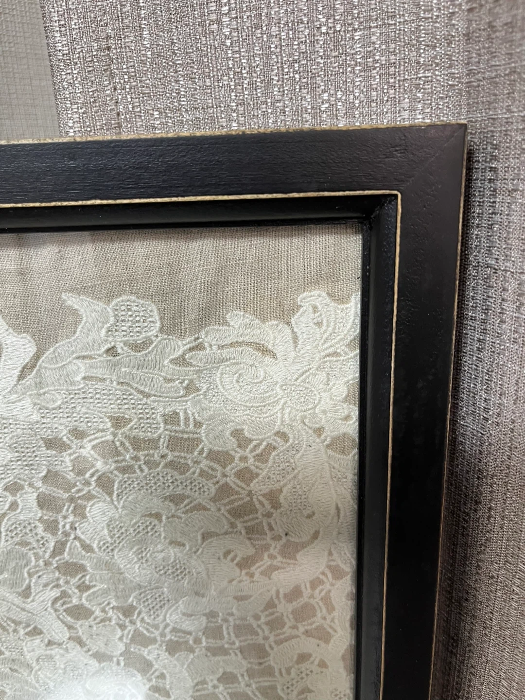 レース模様のアートフレームです。 原宿のインテリア雑貨店で購入した額に、ザラホームのクッションカバーを飾り用に額にはめました。 使用期間も短く、額の中もお好みのものを飾って雰囲気を変えてみてください。 アンティーク調 ・黒色のフレーム ・壁掛け用の金具付き ・中古品 中古品であることをご了承ください。