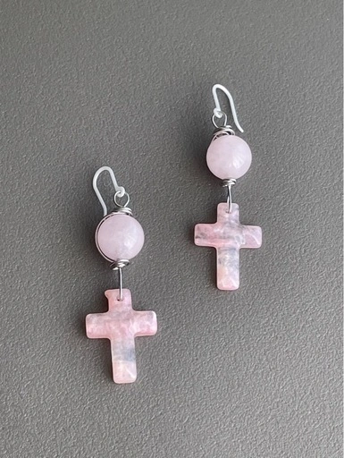 あたたかさローズクォーツにピンクのクロスを合わせた可愛いピアスです。 ピアスフックは樹脂製となっており、金属アレルギーの方にもお使い頂けます。 こちらの商品はハンドメイドアクセサリー「Divina AmoR」が製作しています。 1点1点、全て手作業で心を込めてつくっておりますので同じデザインのものでも少しずつ個体差があり、すべて世界でひとつだけの作品となっております。 使用しているパーツも特に天然石、ビーズを使ったアクセサリーはひと粒ひと粒の型や色に違いがございます。 そのひと粒の違いもニュアンス、味わいと捉えており、更に1点1点に個性がでるデザインをそのまま楽しんで頂けたら幸いです。 金属アレルギーの方の為にもなるべくアレルギー反応が少 なくなるように心がけ製作しておりますが、全てにおいて100%の保証はございません。ご理解の上ご了承くださいますようお願い致します。 ご希望の方はお気軽にご連絡ください。