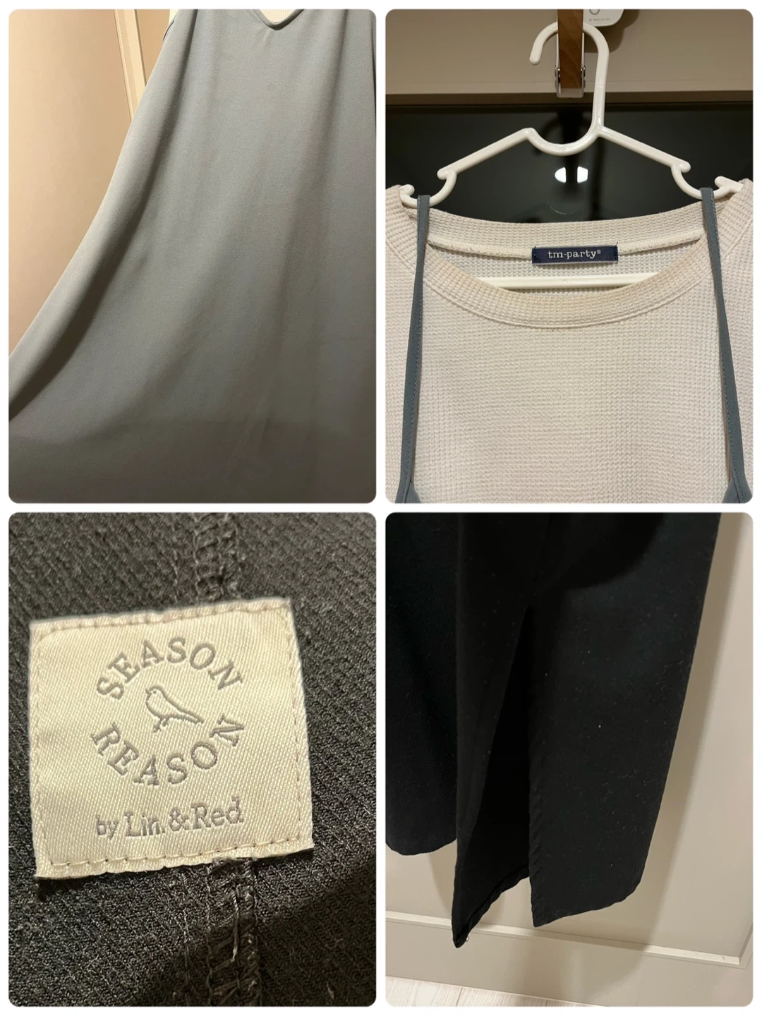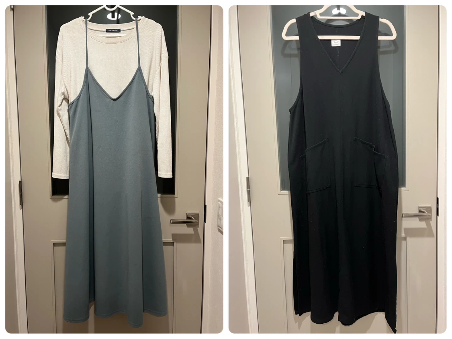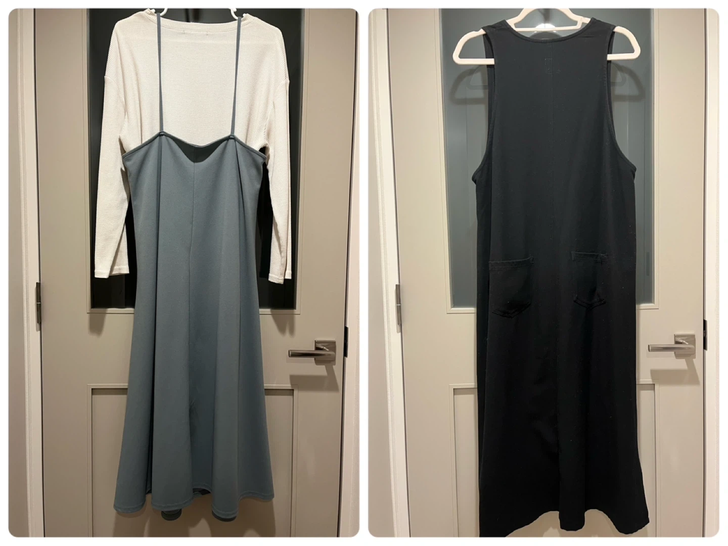 グリーンのマタニティワンピース マタニティMサイズ 伸縮性あり ※ワンピースと中のカットソーは別物です カットソーの方はおまけ程度にお考えください。 ワンピースはマタニティM 白いカットソーはLサイズです。 カットソーは襟あたり着用感あります。 ワンピースはプロペトの跡がいくつかあります。 ワンピース着丈(肩紐から裾まで)約120cm 素人検品のため見落としご容赦くださいませ。 黒のジャンパースカート Lサイズ 左右裾にスリットが入っています。 着丈約120cm 全面と背面に大きなポケットが2つずつあって便利でした。 ゆるっと着られるのでマタニティワンピースとしても使っていました。 目立った傷や汚れはないように思いますが、毛玉はあります。 美品をお求めの方、神経質な方はお控えくださいませ。 古着にご理解いただける方お願いいたします。