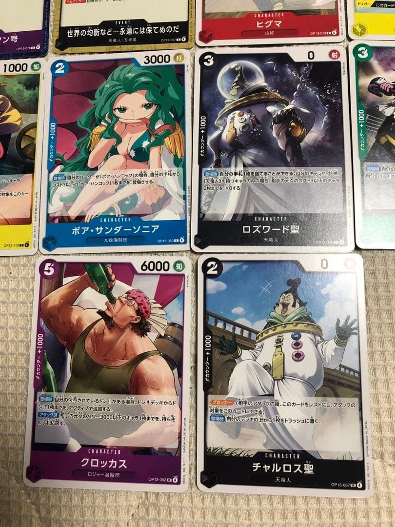 多様なキャラクターが揃ったワンピースカードセット。 - カード名: クロッカス - カード名: ボア・サンーソニア - カード名: チャルロス聖 - カード名: ブルック - カード名: ロズワード卿 - カード名: ヒグマ - カード名: ベグパンクパンク - カード名: ボア・サンダーソニア - カード名: コニー - カード名: ロズワード卿 - カード名: チャルロス聖 ご覧いただきありがとうございます。 ご希望の方はお気軽にご連絡ください。