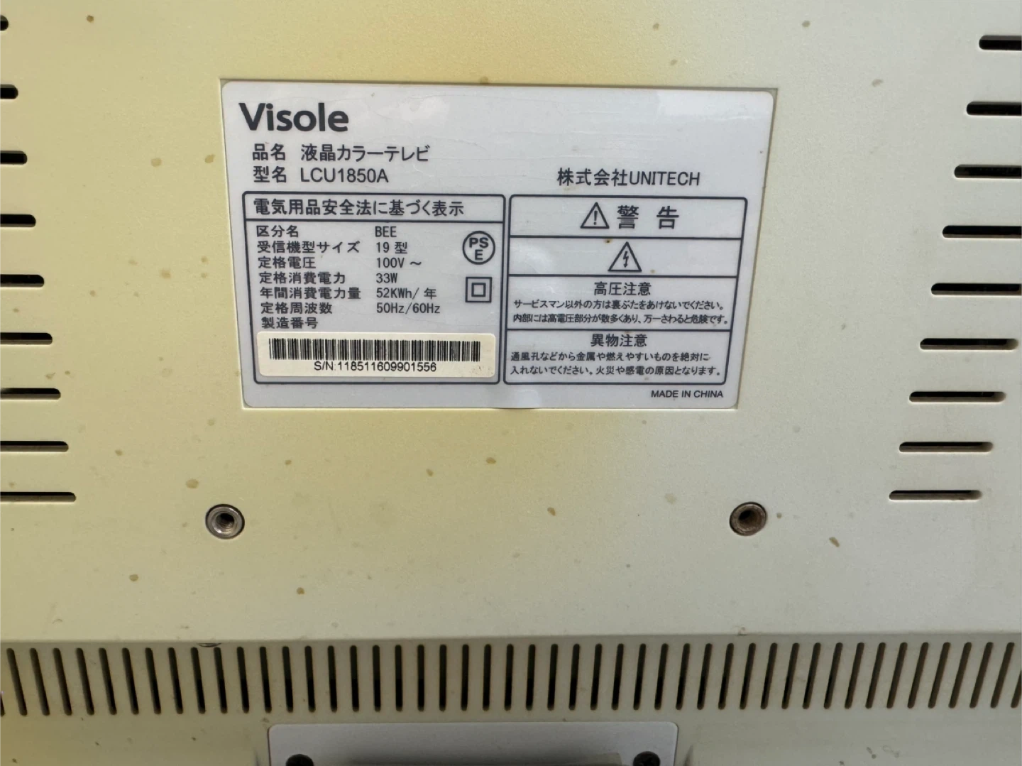 ヴィソーレの液晶カラーテレビです。 【情報】 ブランド:ヴィソーレ 型番:LCU1850A サイズ:19型 定格電圧:100V 定格消費電力:33W 【状態】 中古品、使用感あり 【付属品】 リモコン 最近までモニターとして使用しており、特に不具合はありません。 どなたか貰ってくださると助かります。 ご不明点があればお気軽にご連絡ください。
