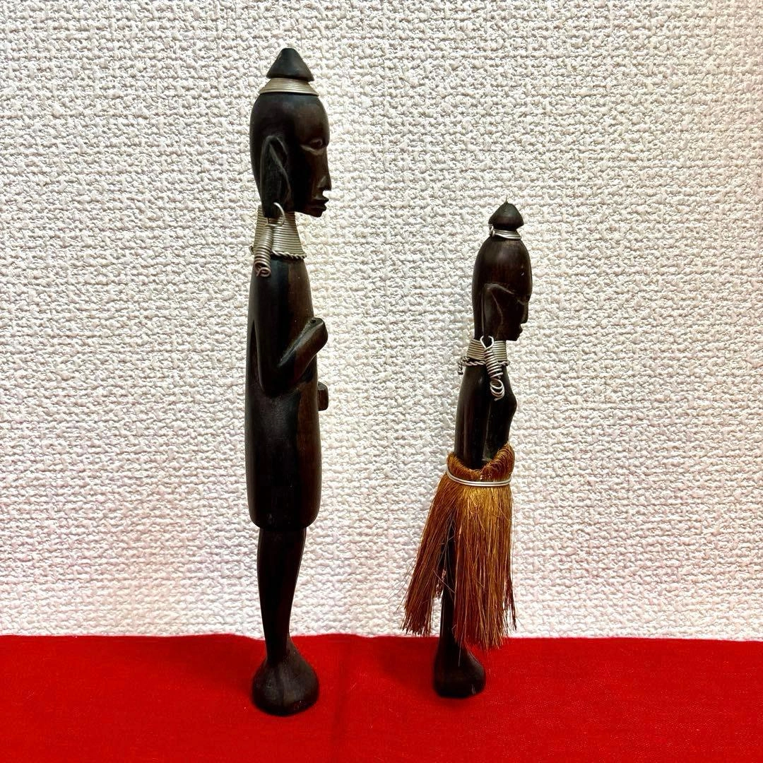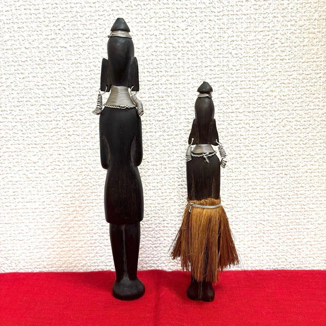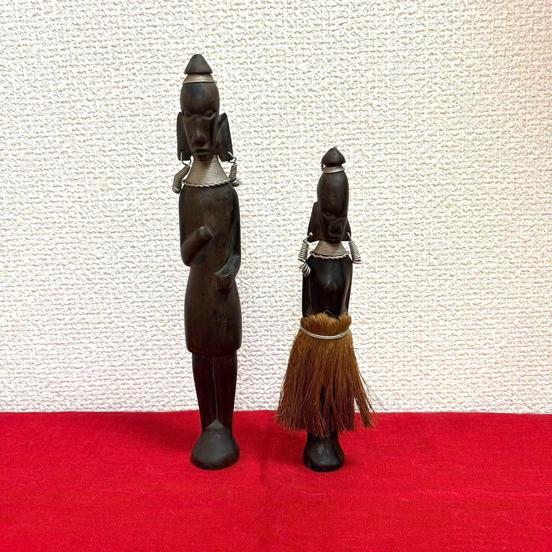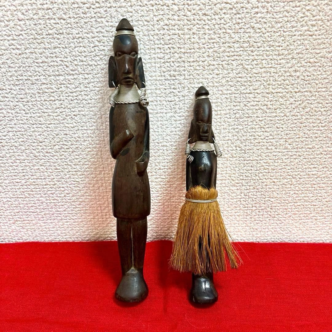 ご覧頂きましてありがとうございます! 家族がかなり前に海外で購入し、長期自宅保管しておりました。 古いものにご理解のある方でお願い致します。 ✴︎サイズ 体長 約20〜25㎝(2体合わせて記載) 元はヤリを持っていたのか?(写真6枚目)分かりかねますがご理解頂ける方でお願い致します。 キャンセル、返品、商品お受け取り後のクレームなどは不可でご了承頂けるようお願い致します。 - 素材: 木製 - デザイン: 彫刻 - 特徴: 装飾的な首飾りとピアス 草のスカート - スタイル: アフリカンアート #民芸品 #オブジェ #木彫人形 #木彫り