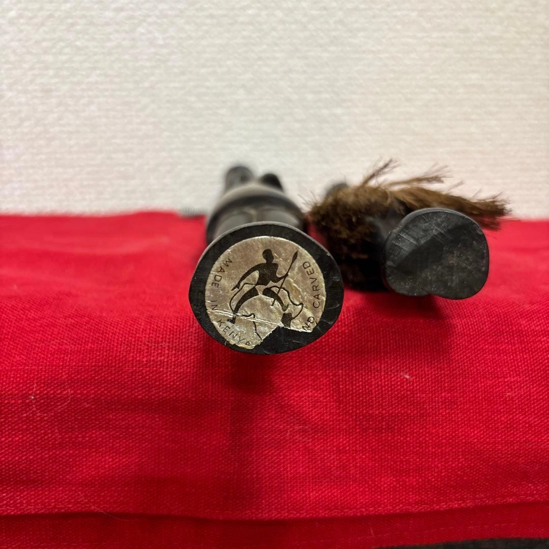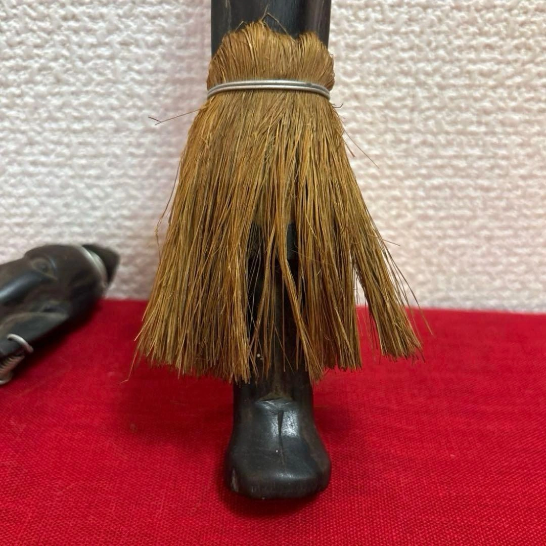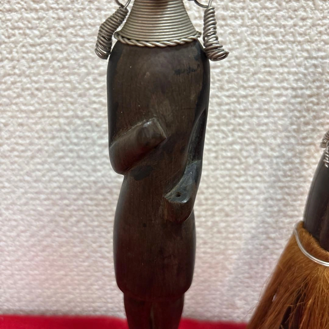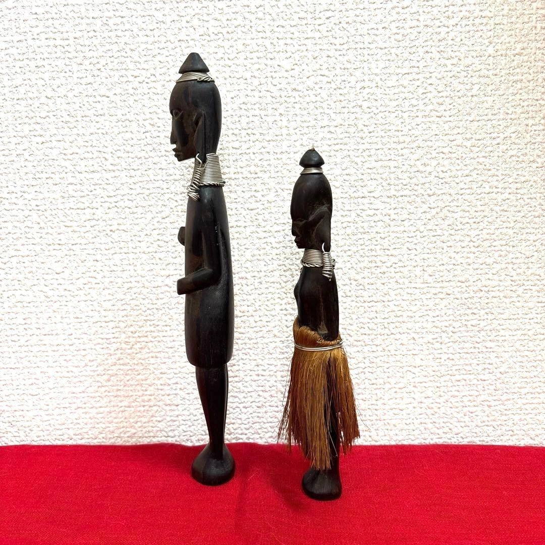 ご覧頂きましてありがとうございます! 家族がかなり前に海外で購入し、長期自宅保管しておりました。 古いものにご理解のある方でお願い致します。 ✴︎サイズ 体長 約20〜25㎝(2体合わせて記載) 元はヤリを持っていたのか?(写真6枚目)分かりかねますがご理解頂ける方でお願い致します。 キャンセル、返品、商品お受け取り後のクレームなどは不可でご了承頂けるようお願い致します。 - 素材: 木製 - デザイン: 彫刻 - 特徴: 装飾的な首飾りとピアス 草のスカート - スタイル: アフリカンアート #民芸品 #オブジェ #木彫人形 #木彫り