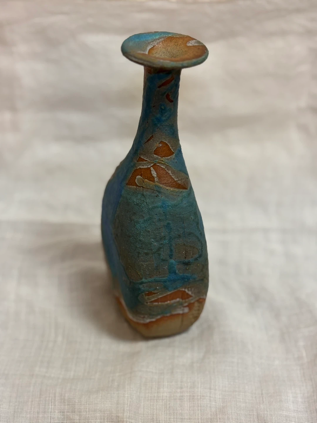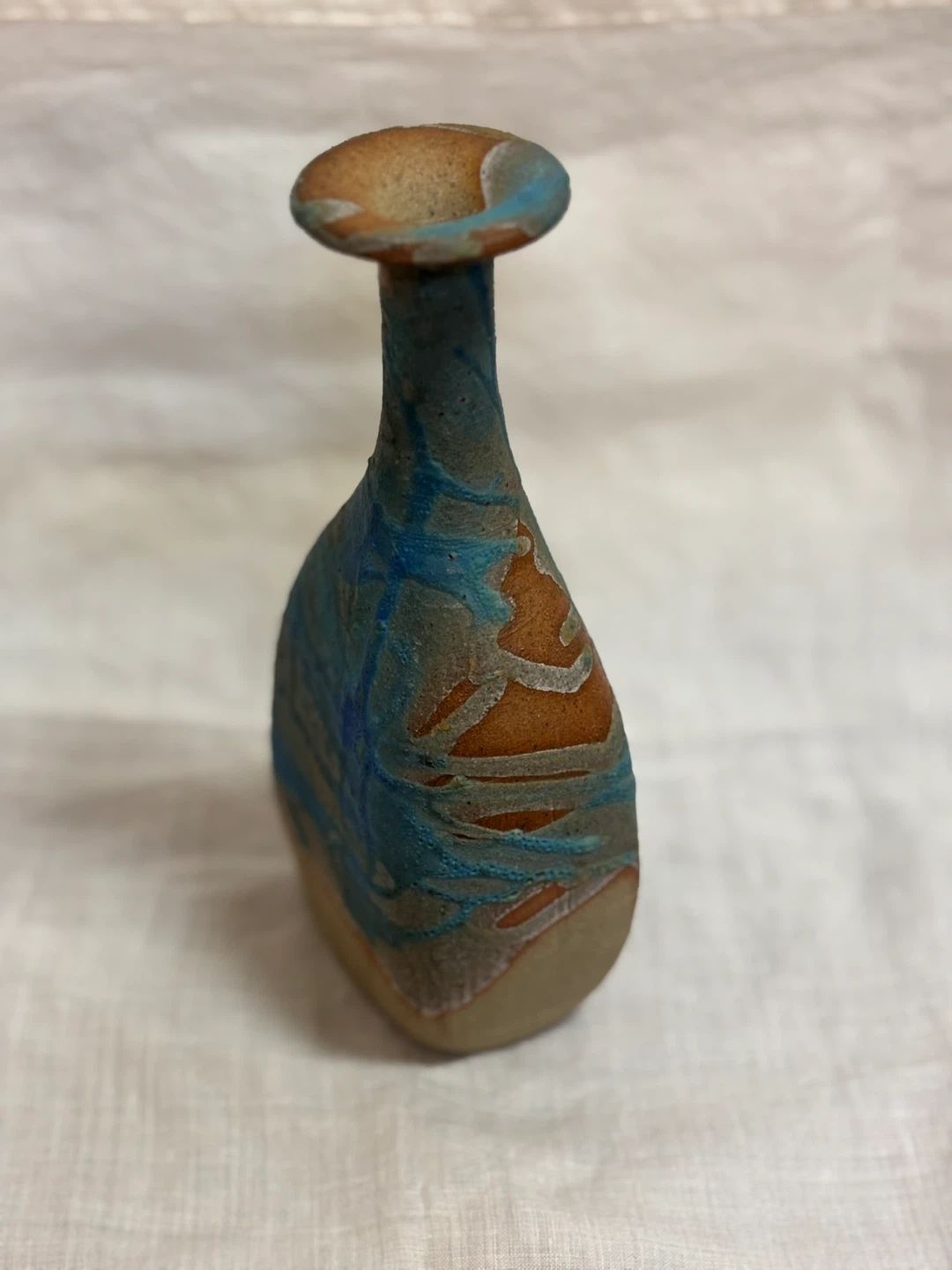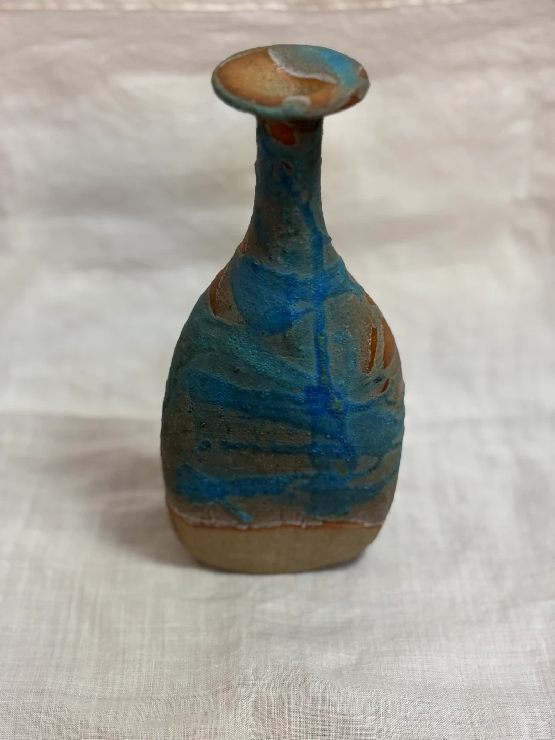 ご覧頂きましてありがとうございます! サインと刻印のある一点ものの陶芸作品です。 青釉が流れるように掛けられており、光の加減で色の表情が変わります。 土の質感と釉薬のコントラストがとても綺麗な作品で、手仕事ならではの温かみを感じます。 一輪挿しとしてもお使いいただけますが、オブジェとしてそのまま飾っても映えるデザインです。 長期自宅保管のものです。 目立つ傷や汚れは見当たりませんが、ハンドメイド・ヴィンテージ作品にご理解のある方のみお願いいたします。 ✴︎サイズ 口径 約4.3㎝ 高さ 約17㎝ 幅 約8㎝ キャンセル、返品、商品お受け取り後のクレームなどはお受け出来ませんので、ご了承頂けるようお願い致します。 #ミニ フラワーベース #アンティーク花瓶 #一輪挿し #インテリア #オブジェ #陶芸作品 #Art Pottery #作家もの #青釉 #花器 #陶器のある暮らし #ヴィンテージ花瓶 #工芸品 #手仕事のうつわ