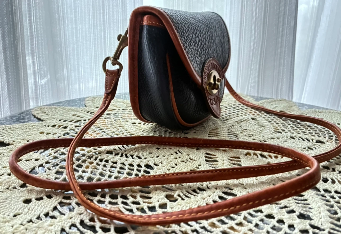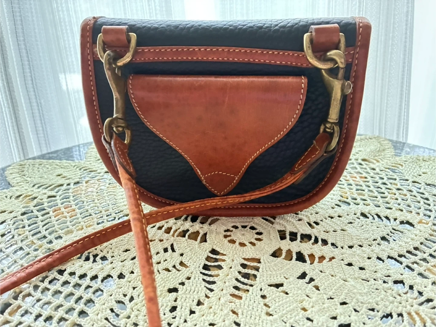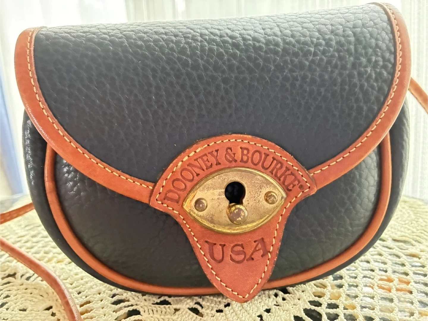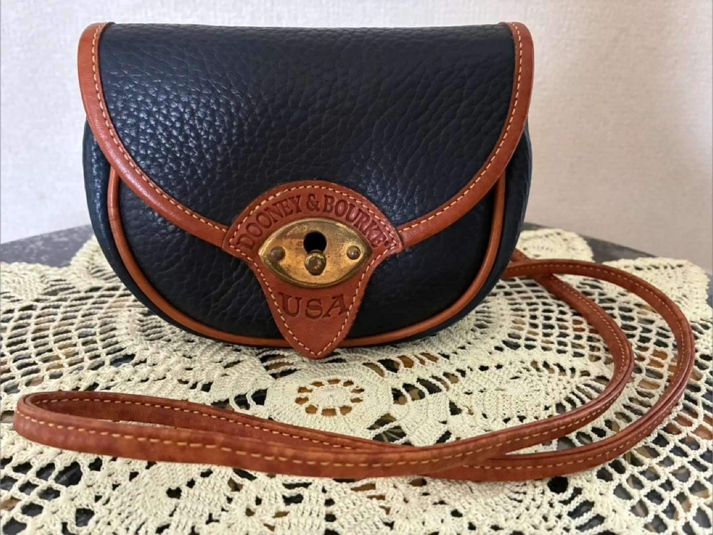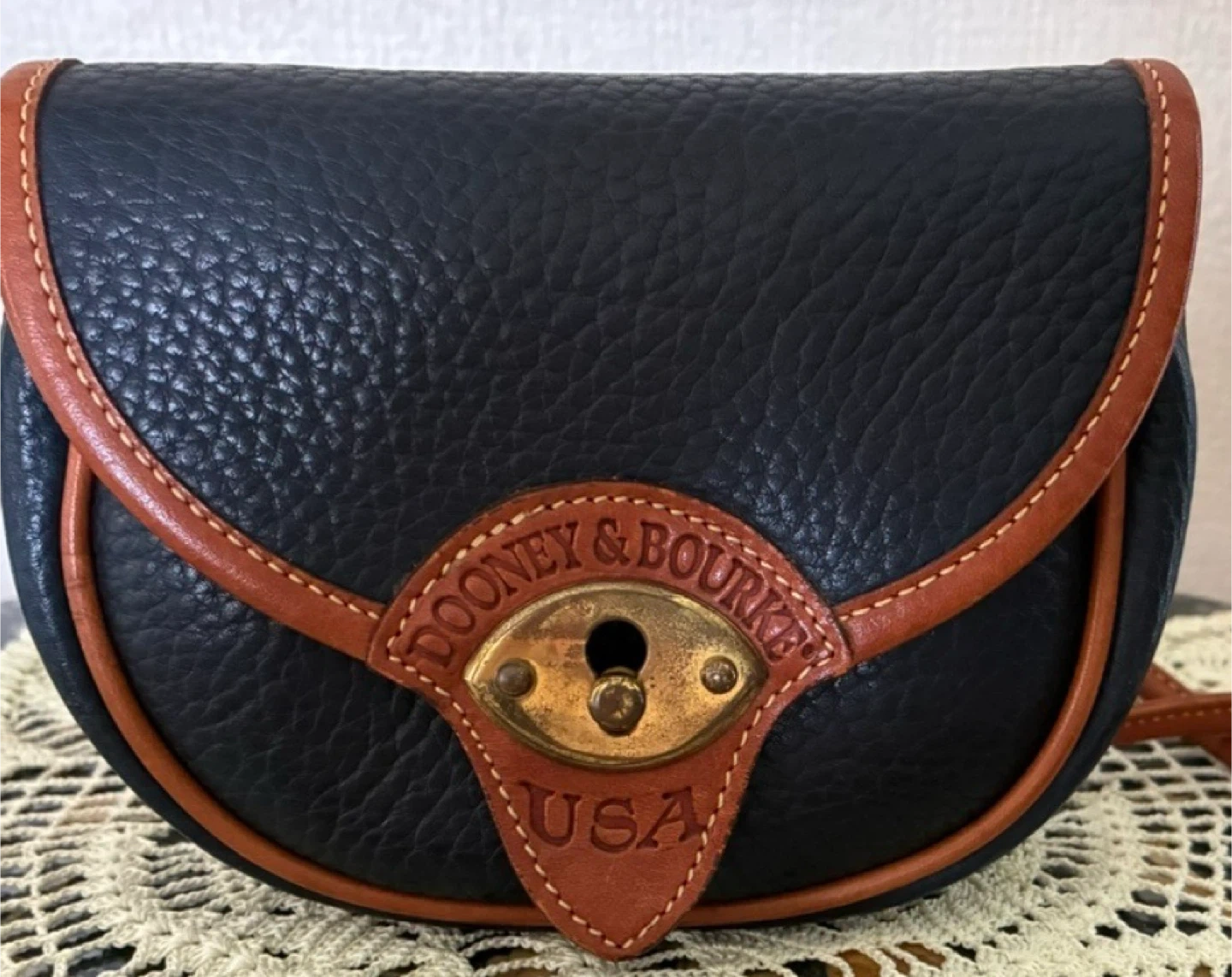 真鍮製ターンロック金具に “DOONEY & BOURKE USA” の刻印が入った、 ブランド初期の象徴的なデザイン。 【商品詳細】 ブランド:Dooney & Bourke(ドゥーニー&バーク) 製造国:USA サイズ:約 縦14cm × 横16cm × 奥行6cm カラー:ブラック × ブラウン 素材:オールウェザー・レザー(防水レザー) 開閉:ターンロック式 状態:金具に経年のくすみあり。 レザー部分に多少のスレはあります が、形崩れなく良好です。 販売価格¥15,000〜¥20,000程 価格交渉および受渡し場所等、お気軽にお問い合わせください♪ どうぞ宜しくお願いいたします。