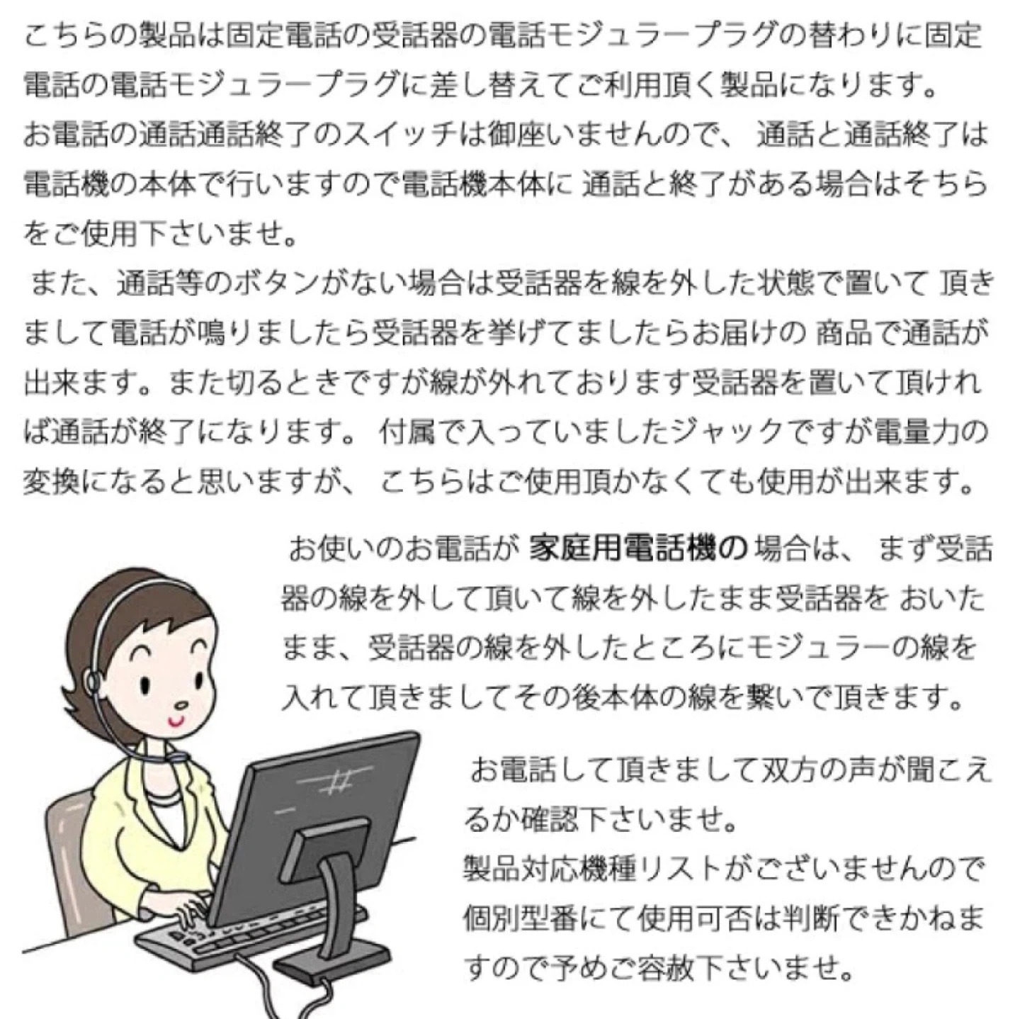 固定電話機用ヘッドセットです。 ビジネス家庭用固定電話交換受話器 RJ-11モジュラー電話回線端子 在宅テレワーク[ケーブル長さ:約1.4m] ネットで販売している電話機用ヘッドホンは モジュラー端子がRJ-9が一般的ですが 通常の固定電話のモジュラー端子はRJ-11なので 電話機を探すのに苦労していました。 そこでやっと見つけたのがこちらの 直接一般固定電話機に繋げられるヘッドホンです。 手軽さで人気のようですが 仕事として使うコールセンター用電話機とヘッドホンのセットを他で購入したため出品します。 商品は購入後袋一度だけ袋から取り出しましたが未使用です。 特に説明書などもなく、OPP袋に入って 送られて来たのでそのままお送りします。 マイクのアームも自由に曲がり使い勝手は 良さそうですが、音声チェックなどはしていないため 諸々神経質な方はお気をつけください。 (楽天、Candyにて購入、写真参照) ⚠︎試着はしておりませんので耳やマイクの衛星には 問題ございません。 (神経質な方はご注意ください) ⚠︎用途、仕様をご確認頂き、お間違い無いようご注意ください 【情報】 ブランド:ユーチェル 【状態】 未使用品 【定価】 4,413円 【受け渡し】 地下鉄有楽町線、副都心線「小竹向原駅3番出口」 地上セブンイレブン前 (電車で来られる方は改札内受け渡し可能)