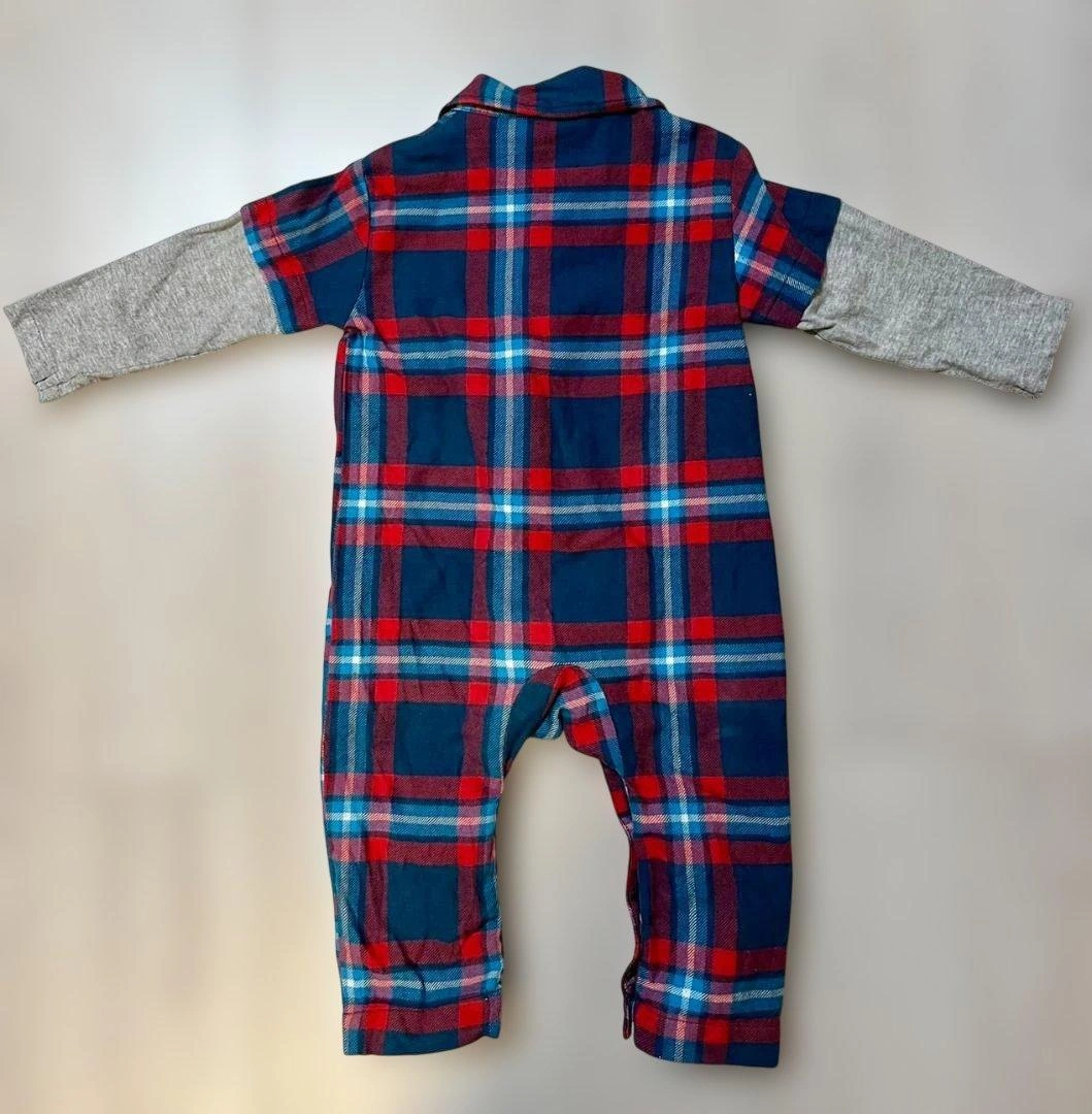 チェック柄の重ね着風のアメカジカバーオールです。 - ブランド: Little Traveler - サイズ: 18M(80くらい) - 素材: 100% コットン - デザイン: チェック柄 × 無地 - カラー:赤・青・白(チェック柄)× グレー(無地) ご覧いただきありがとうございます。 お出かけ着として使用していたので目立った汚れはないのですが、初期不良で縫い代が不足していたようで、前立ての角の部分が少しほつれています。(3,4枚目の黄色○部分) チャックの青は緑みがあってきれいな色です。 インポートもので他と被らないデザインがかわいいです☺ お渡し場所は目印になる成城郵便局ですとスムーズですが、成城近辺なら気軽にご相談ください。