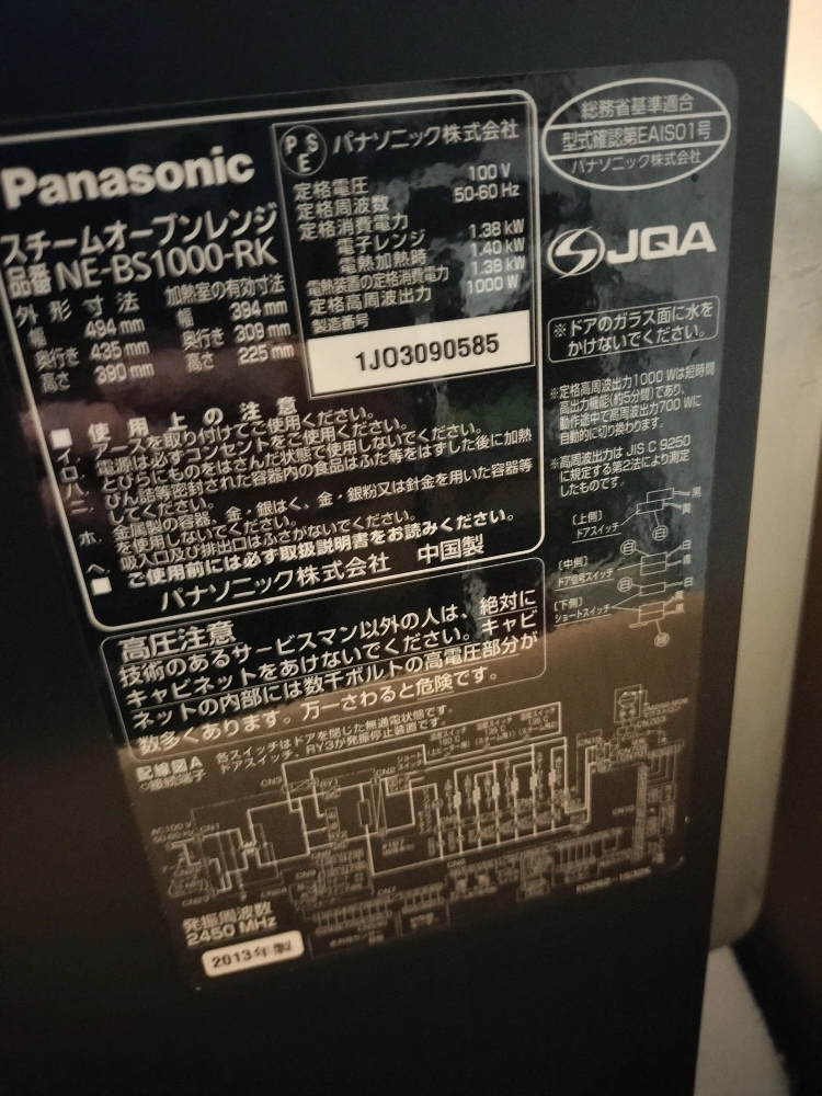 2025/09末まで使用していた電子レンジです。 引っ越しを機に買い替えたため出品します。 本体、アース線となります。 グリル皿、説明書はありません。 2013年製ですが、つい先日まで使用していました。 扉の右の金具か何かが外れたようで、スタートボタン押下時に扉を少し押さえていないと動き出しません。 それ以外は特に不都合はありませんでしたが、使っていない機能などは未確認ですので、ご了承ください。 日常使用していましたので、キズや汚れが見られます。 中古ということをご理解のうえご検討をお願いします。 購入時とは別の箱に入れてお渡しします。 クルマで無いと運搬出来ないと思いますので、クルマでお越し頂くことをおすすめします。 商品の詳細は以下をご参照ください。 https://panasonic.jp/range/products/NE-BS1000.html https://torisetsu.biz/products/0000030308/