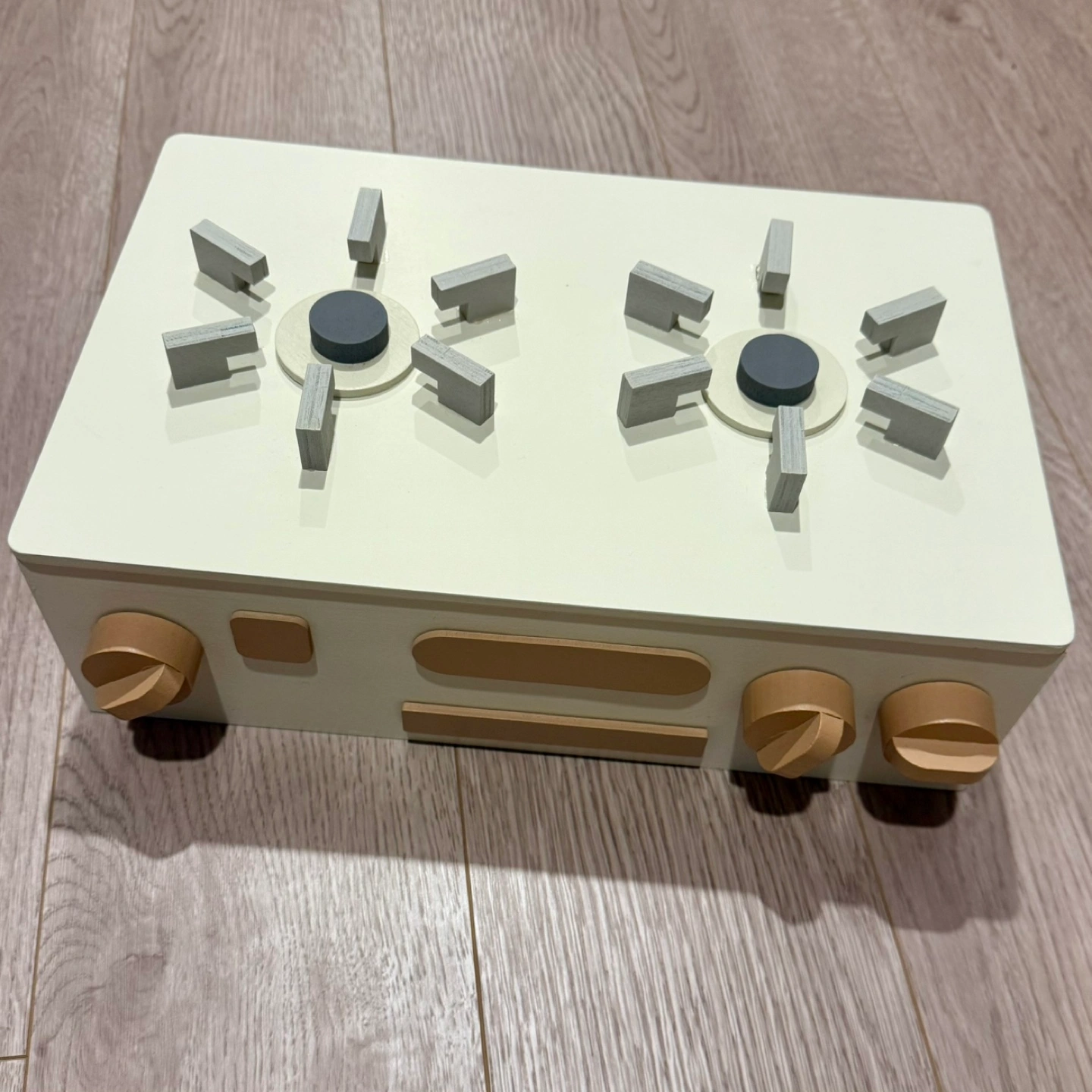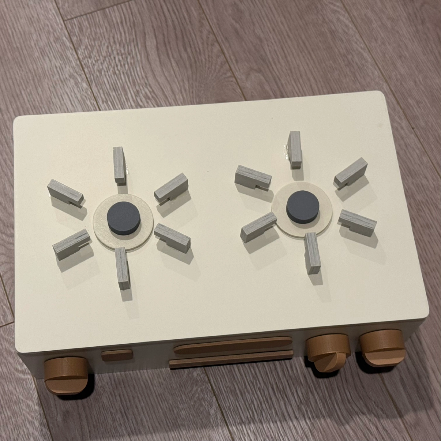 スリーコインズ 定価1650円 現在販売されておらず、再販待ちの方が多い人気商品です 中は箱のようになっているので、フライパンや食材などおままごとのおもちゃを収納できます 我が子にはまらず、ほぼ飾っているだけになっていました 不注意によりグレーのパーツ(五徳)2本がとれてしまい、木工用ボンドで接着・補修しています スリコ 3COINS