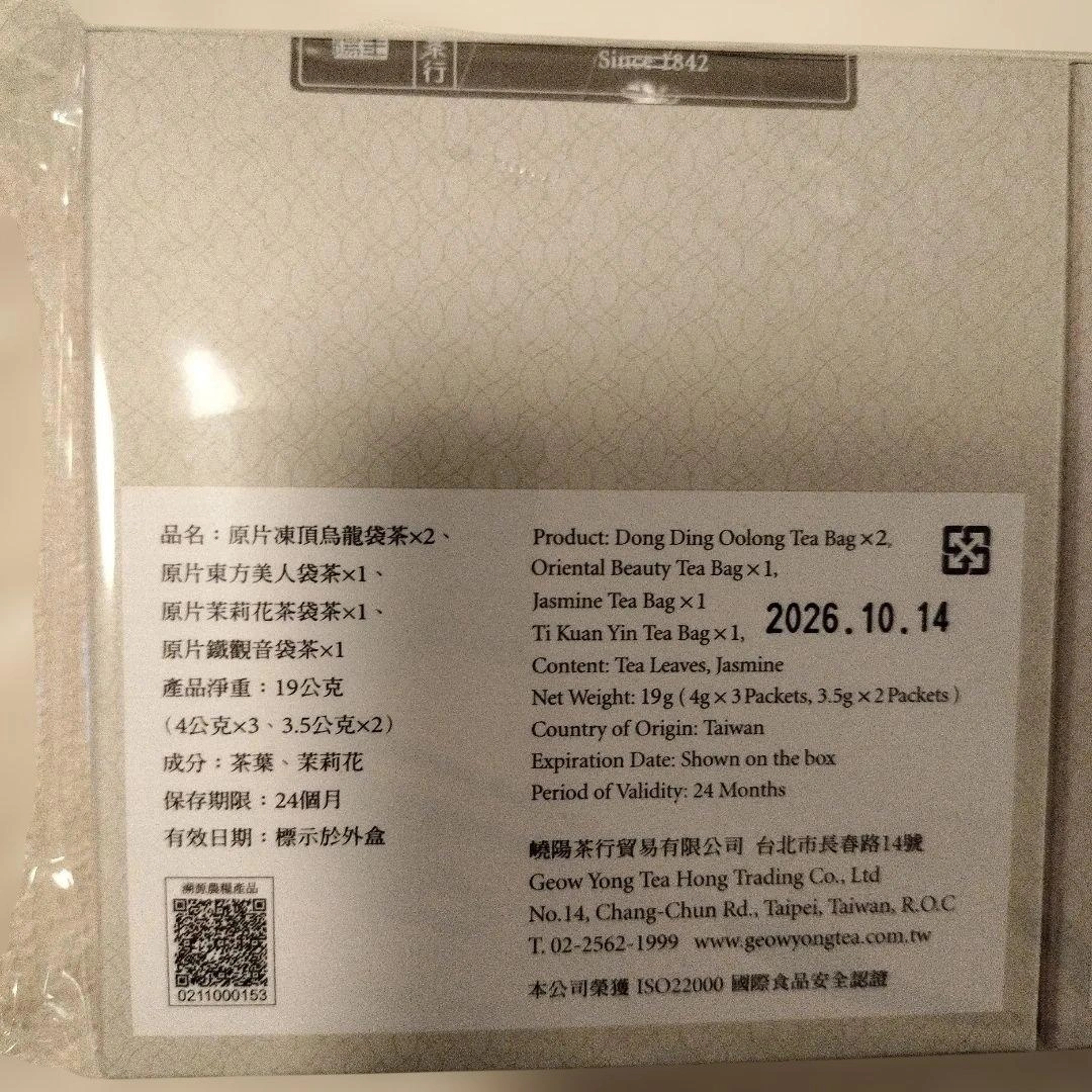 台湾の高品質な烏龍茶とジャスミン茶のセットです。 台湾茶専門店で有名な嶢陽茶行(ヤオヤンチャーハン Geow Yong Tea Hong)のオリジナルティーバッグ2箱セットです。 日本未上陸の人気商品をお試しにいかがでしょうか? - 種類: 東方美人茶、烏龍茶、ジャスミン茶、鉄観音茶 - 内容量: 19g - 原産地: 台湾 - 賞味期限: 2026.10.14 ご覧いただきありがとうございます。