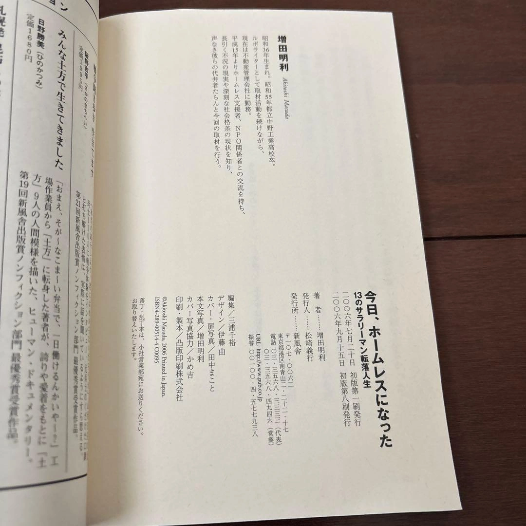 ホームレスになった13のサラリーマンの転落人生を描いたビジネス書です。 - タイトル: 今日、ホームレスになった - 著者: 増田明利 - 定価: 1200円 - ISBN: 9784289005147 ご覧いただきありがとうございます。 ご希望の方はお気軽にご連絡ください。