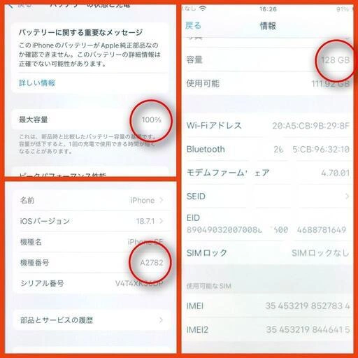 機種変のため出品します。 128GBのiPhone SE 3、バッテリーは100%交換済み、動作良好です。 ●詳細 ・外観 : 側面にごくわずかなスレ傷、カメラフレームに塗装剥げがあります。使用に支障があるような傷やダメージではないと思います。ガラスコーティング加工済みです。 ・機能 : 不具合なし(動作確認OK) ・IMEI(製造番号)=354532198527834 ・バッテリー100%(11/9に交換。社外品ですが問題なく使用できます) ・SIMフリー ・交換歴(バッテリー)・水没歴なし ・残債・ネットワーク利用制限なし ・アクティベーションロック解除済み ・初期化済み 非喫煙、ペットは飼っていません。 出来る限り現状を見て記載していますが、写真や説明以外に見落としがあるかもしれません。 その他、気になる点はお気軽にご質問ください。 ご覧いただきありがとうございます。 シリーズ...iPhone 機種名...iPhone SE (第3世代) スマートフォン カラー...ミッドナイト 容量...128GB 機能不良...なし