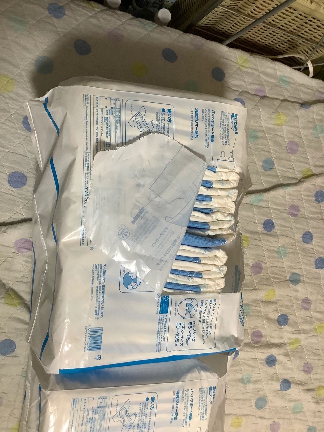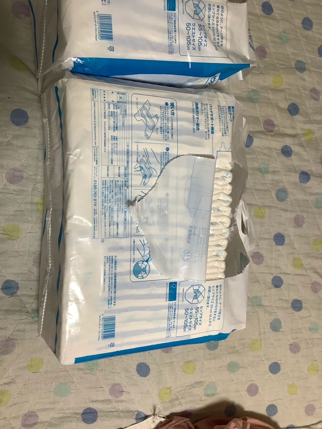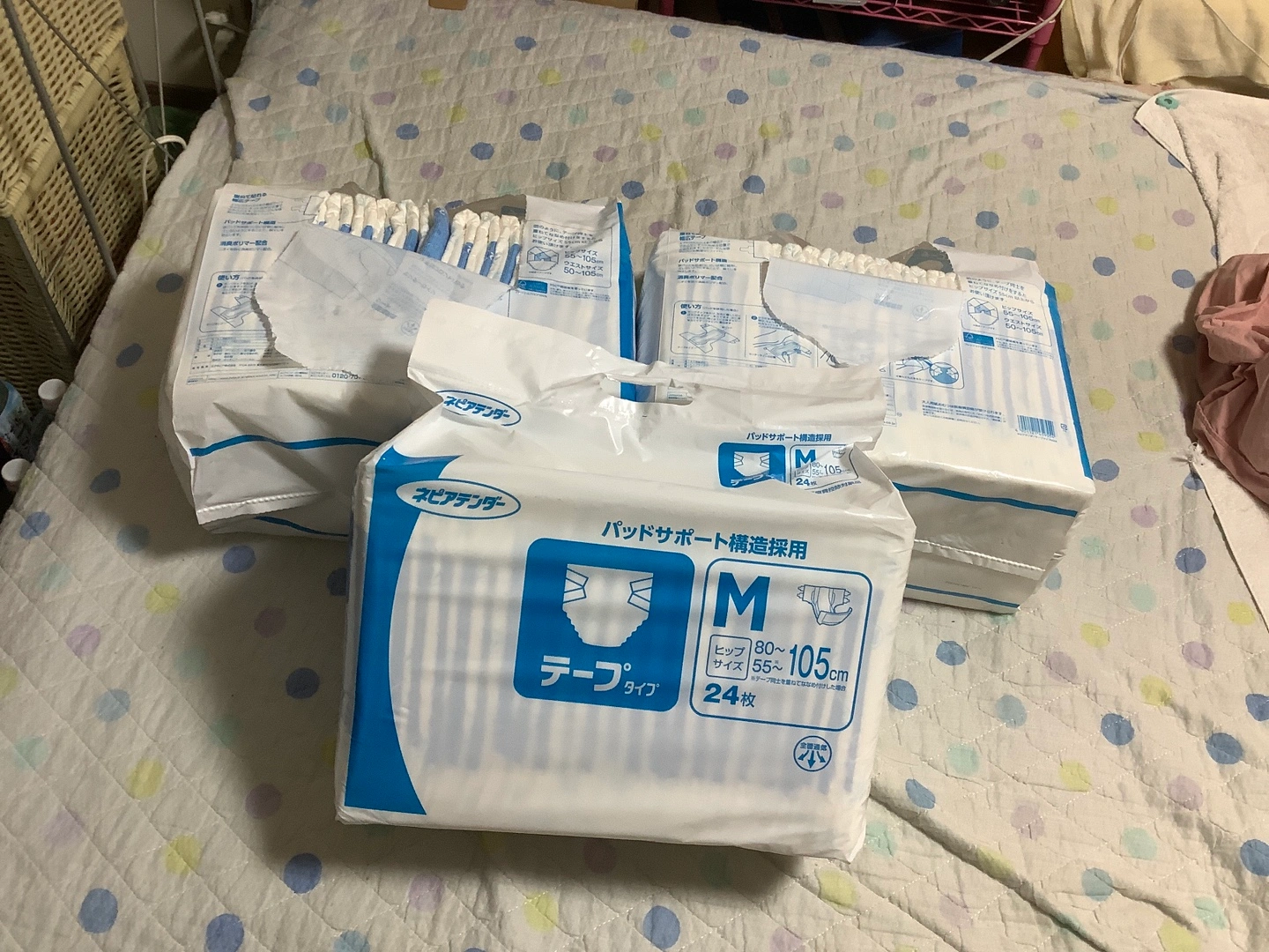 ・ネピアテンダー ・テープタイプ ・サイズ:M(ヒップ80〜105cm、サイズ55〜105cm) ・24枚入り 未開封1パックと開封済23枚と開封済18枚。