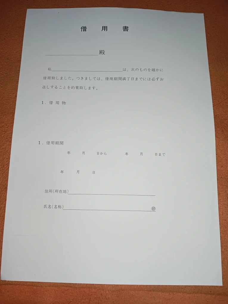 借用書です。 借用に関する書類です。 コピーしてあります。 ※場所 ローソン花畑一丁目店 竹ノ塚駅 この二択になります コピー代金として10円をお持ちください ※複数枚欲しい方は枚数の指定もお願いします 気になる方はコメントよろしくお願いします ※主に貸したい方は一言お願いいたします