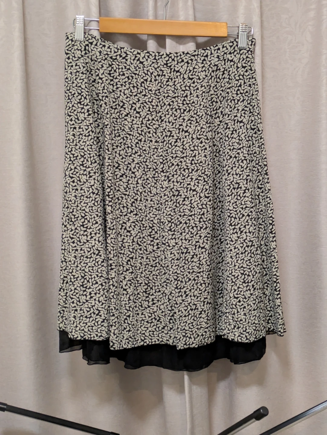 花柄のリバーシブルスカートです。 ・サイズ:L(ウエスト69〜77cm) ・素材:ポリエステル100%、ニット部分 ポリエステル92% ポリウレタン8% ・色:黒と白の花柄 ・状態:使用感少なめ ・丈:花柄面 約59cm 黒色面 約63cm (素人採寸なので、目安程度にお考え下さい) お取引は世田谷線松陰神社前駅付近。 平日は19 時以降、週末は調整可能です。 よろしくお願いします。
