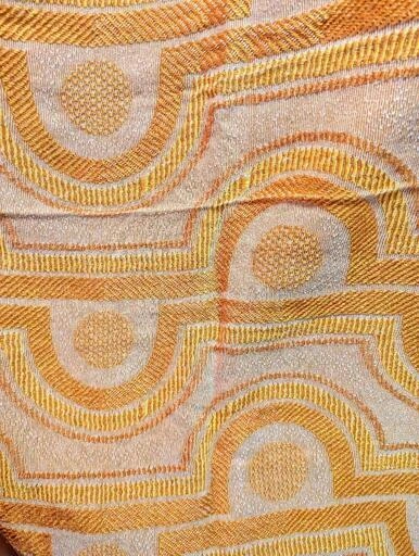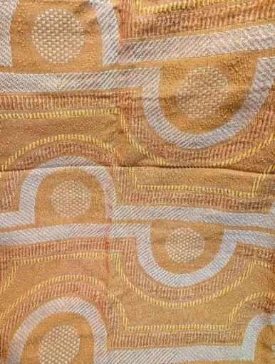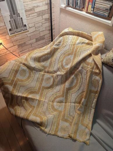 本物の70年代日本製デッドストックの柄布です。 カーテン程度の厚み、プリントではなく織り、(写真に裏表両柄載せました)70年代の素敵な模様です。 他に出品の色柄より薄めの生地で、片側の端部分だけ少しほつれがありますのでご了承ください。 クッションやランチョンマット、ショッピングバッグなどに。2000年代初頭に買い、未使用で保管していました。 サイズは大体90cm×103cm(素人採寸ご了承ください) 他の色柄と同時購入の場合はお気持ちお値引きいたします。