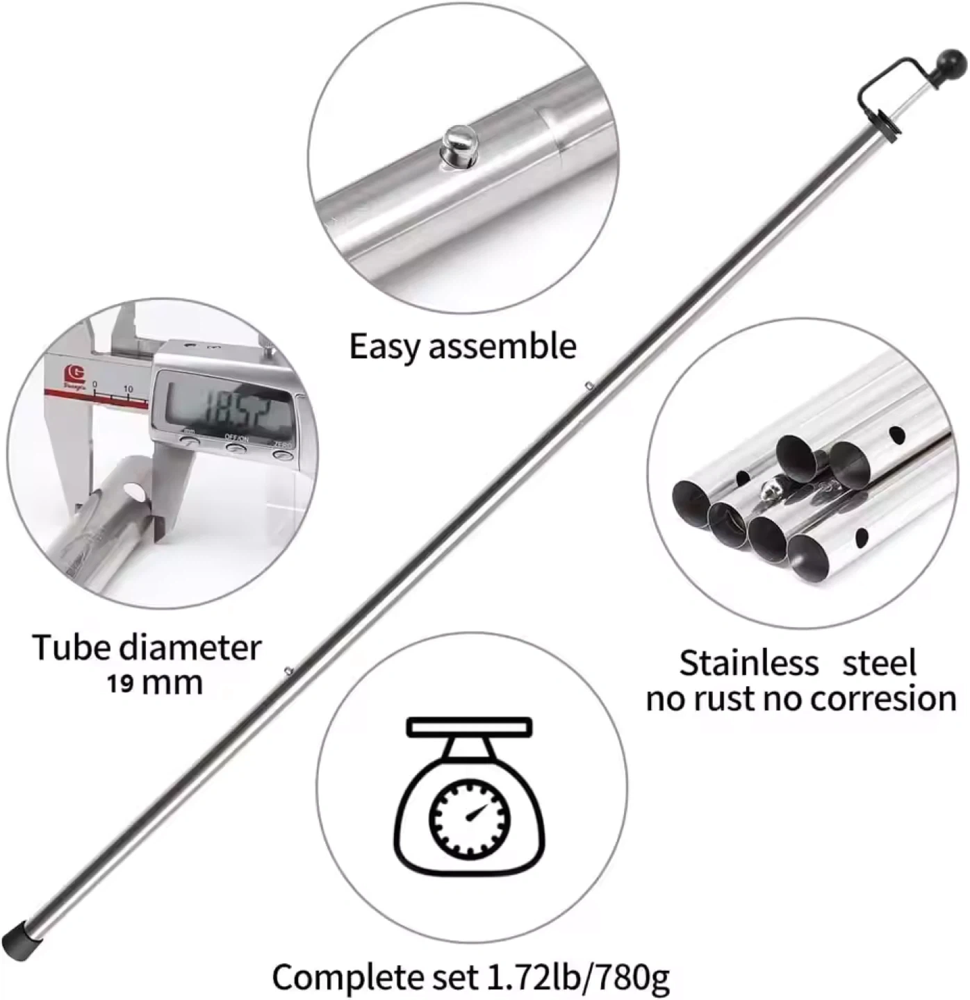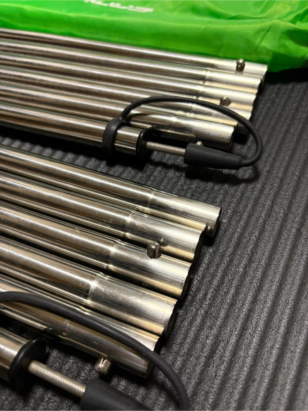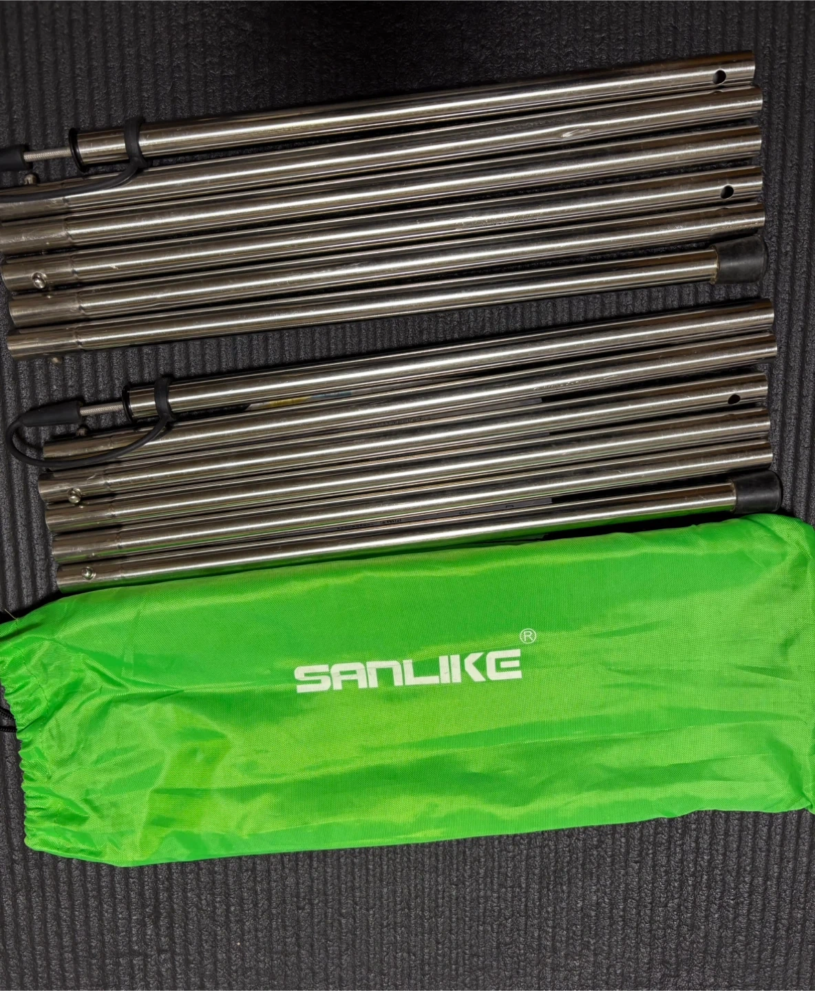 使わなくなったのでお譲りします。キャンプで何回か使用していますので擦れなどの使用感はあります。 Amazonで購入したものです。 ちなみに、購入時の価格は3,580円です。 参考まで現在扱っているAliExpressでは2,536円でした。 https://ja.aliexpress.com/item/1005009320393909.html?spm=a2g0n.productlist.0.0.55c74300mFEDKG&browser_id=cef31ae6f5f6437db50c444e3324f996&aff_trace_key=6649d91a61c142e9a95b13fa36440dd5-1764926875114-03624-UneMJZVf&aff_platform=msite&m_page_id=mpoiwhgdbacatxft19aedd9829b1ea5b6f1fb04406&gclid=&pdp_ext_f=%7B%22order%22%3A%2216%22%2C%22eval%22%3A%221%22%2C%22fromPage%22%3A%22search%22%7D&pdp_npi=6%40dis%21JPY%218230%212536%21%21%21368.26%21113.48%21%402101529317649270462808639e7361%2112000048740246545%21sea%21JP%210%21ABX%211%210%21n_tag%3A-29910%3Bd%3Acf931b21%3Bm03_new_user%3A-29895%3BpisId%3A5000000187481041&algo_pvid=d0c711c3-507e-4e99-b413-2b5b6b3f8769&_universallink=1&m_page_id=mpoiwhgdbacatxft19aedd9829b1ea5b6f1fb04406 プッシュボタン式 ステンレス製でとにかく軽いです。 ちなみに耐久性に疑問をもたれるかもしれまぜんが、強風時にも使用してましたが、まったく問題ありませんでした。 6節連結タイプ 長さおおよそ76cm~230cmまで40cmごとにご調節可能 直径は19 mm 東武東上線東武練馬駅や都営三田線高島平駅周辺でも引き渡しも可能です。