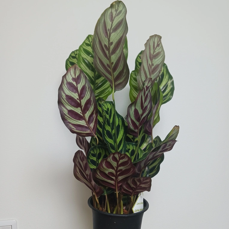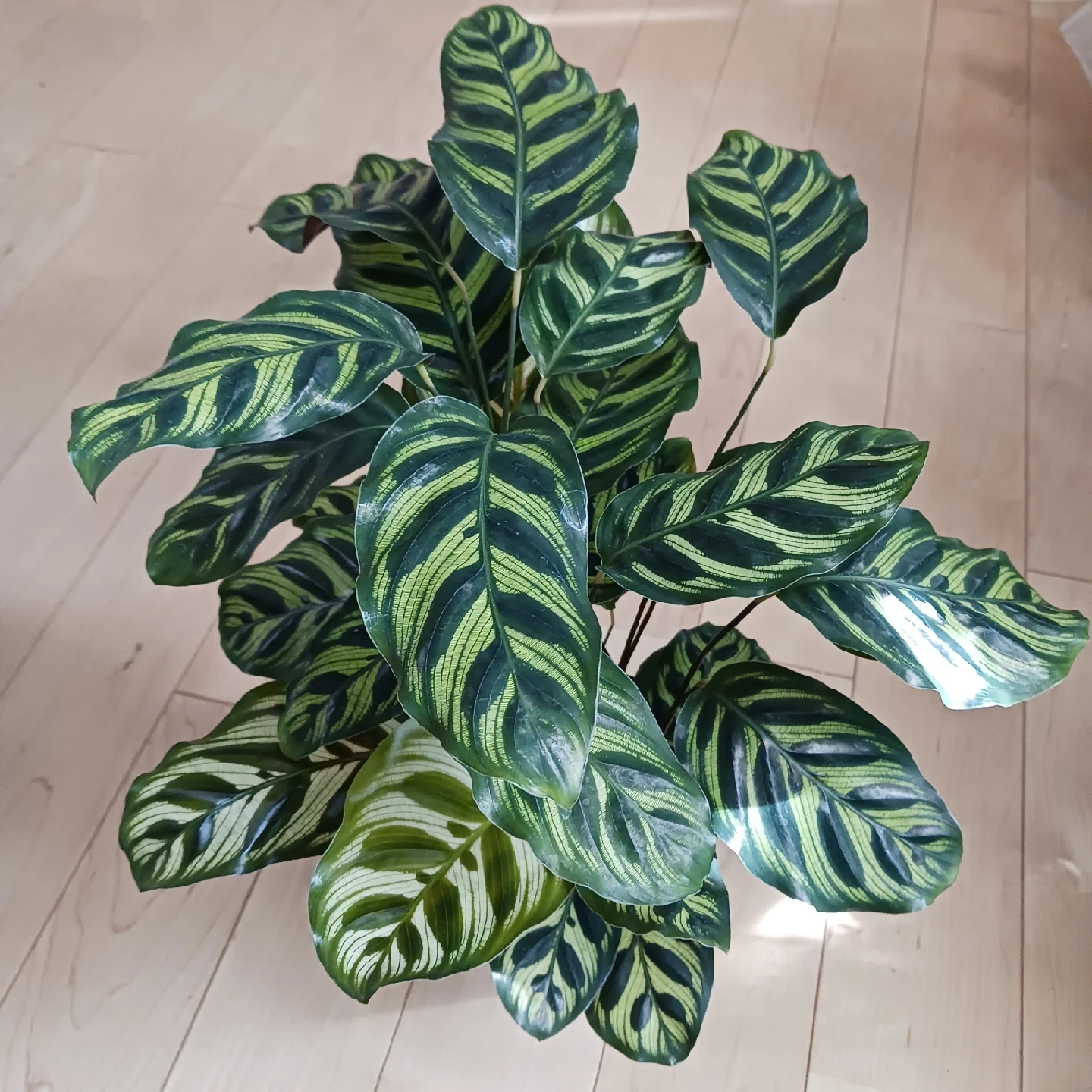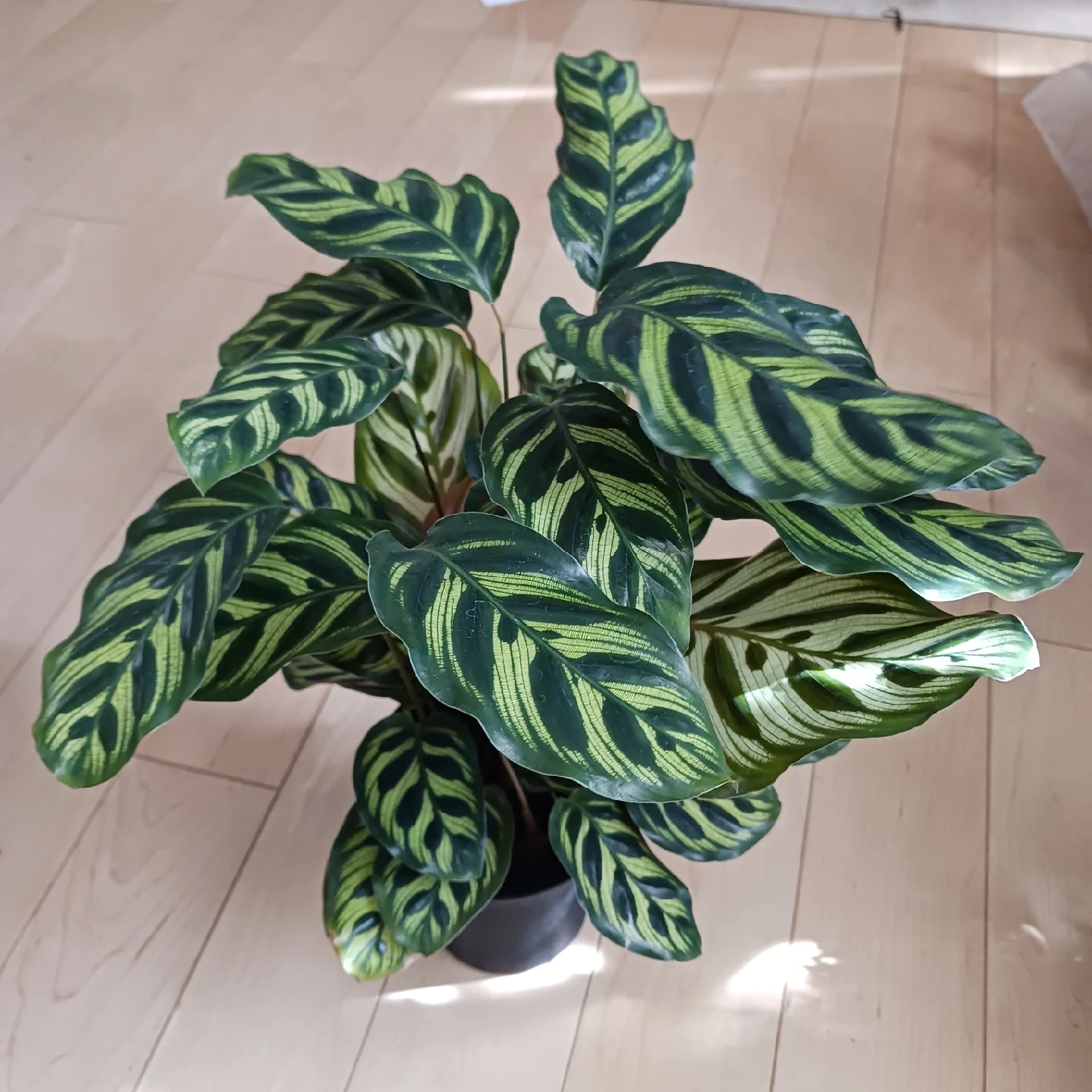 あたたかさ葉の模様が特徴的なカラテアの中でも人気のマコヤナです 空中湿度を保つと綺麗な葉を維持しやすいです 夜は葉を閉じる就眠運動をするので、観察する楽しさもあります(最後の画像参照) 黒のプラ鉢サイズ 直径13cm 高さ13cm 植物目安サイズ(鉢込) 横幅35cm 高さ55cm
