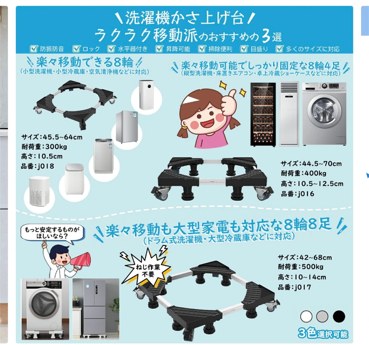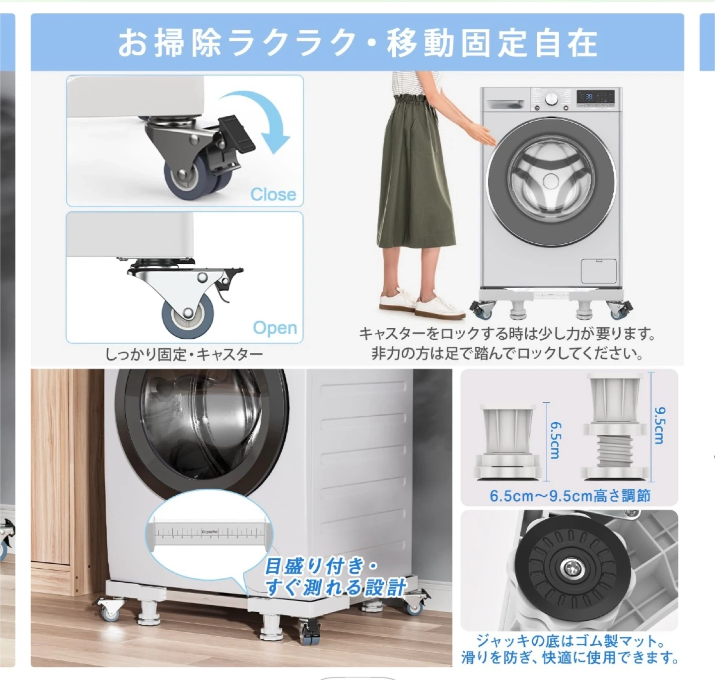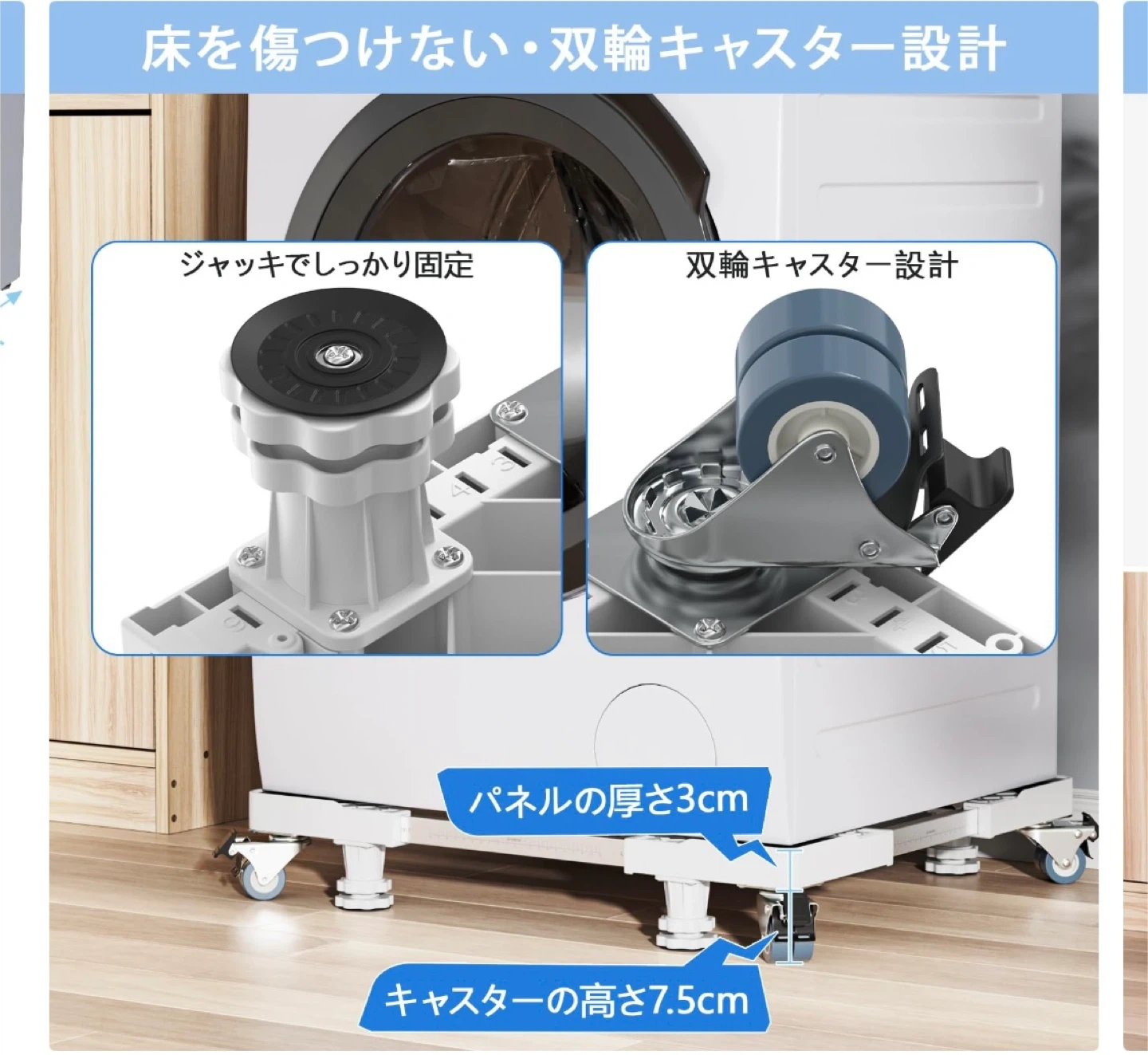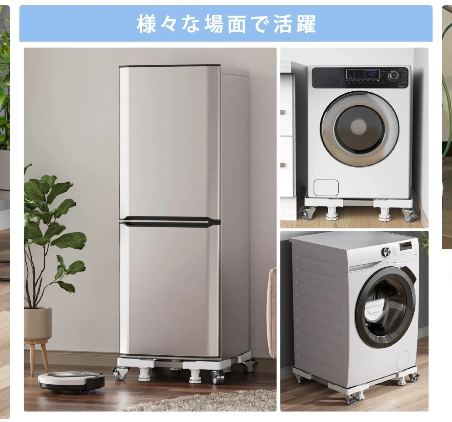 冷蔵庫や洗濯機の下もお掃除ラクラク!サイズ調整も自由自在な洗濯機キャスターです! ・キャスター付き(8輪4足) ・サイズ調整可能 (幅:44.5~70cm) ・高さ調節可能 (高さ:10.5~12.5cm ) ・防振防音 ・ロック機能付き ・水平器付き ・サイズ目盛り付き ℹ️購入時に私がショップから受けた商品説明 (私が商品の品質を保証するわけではありません) ・床を傷つけない双輪キャスターが採用され、女性一人でも簡単に家電を動かせます。 ・お掃除もラクラクに。 ・各車輪は360°回転できる上ロック付きで、移動固定自在はもちろん、使用時の快適さも魅力的です。 ⚠️注意点 ・開封、組み立て後、未使用(冷蔵庫を乗せていない)状態です。 ・本体には傷汚れはありません。 ・黒い三角形のクッション剤に若干の傷があります。使用時は隠れる位置かつ、使用に問題ないレベルですが、気になる方はご遠慮ください。(最後の画像をご参照ください) 冷蔵庫 洗濯機 置き台 キャスター付き かさ上げ台 伸縮式 嵩上げ台 360度回転 高さ調整 スライド台 洗濯 ドラム 台車 減音 防振 ズレ防止 洗濯機パン 8輪 四つ足 4足 家具 家電 掃除 便利 移動
