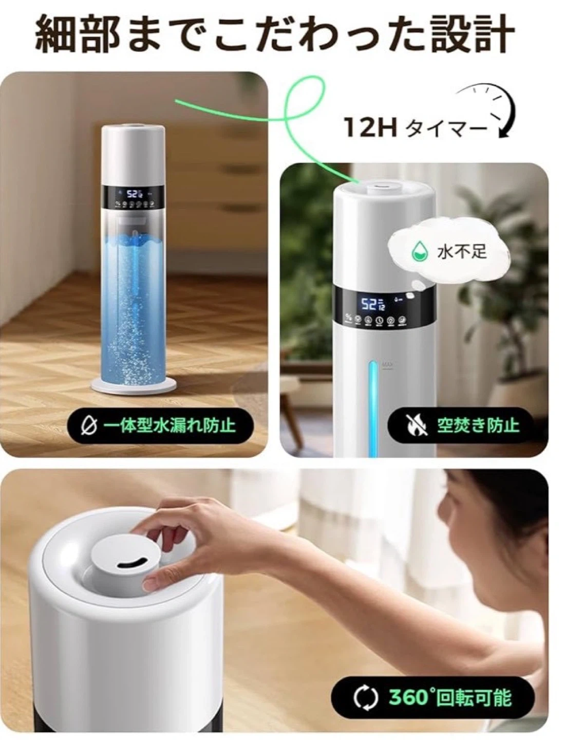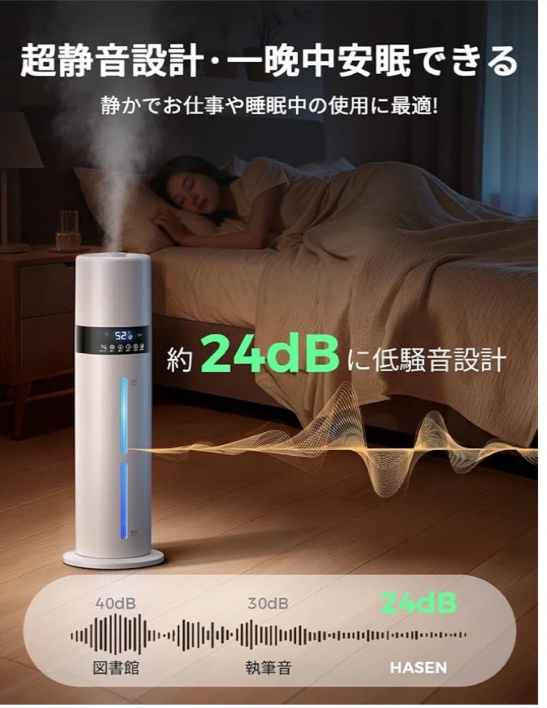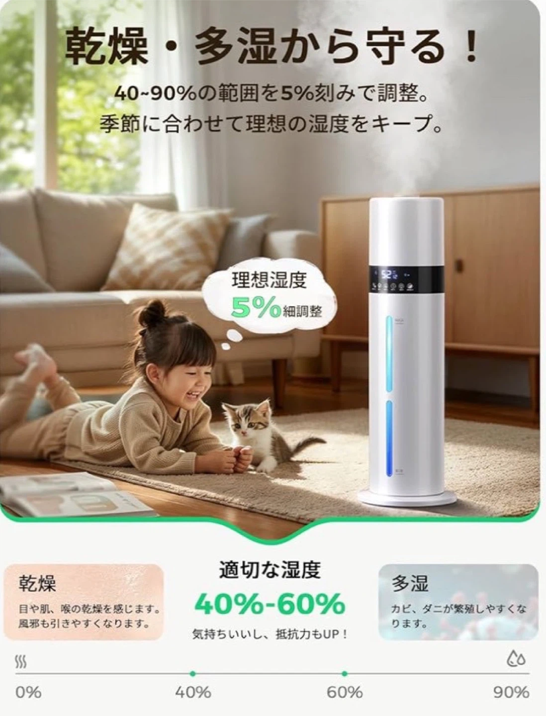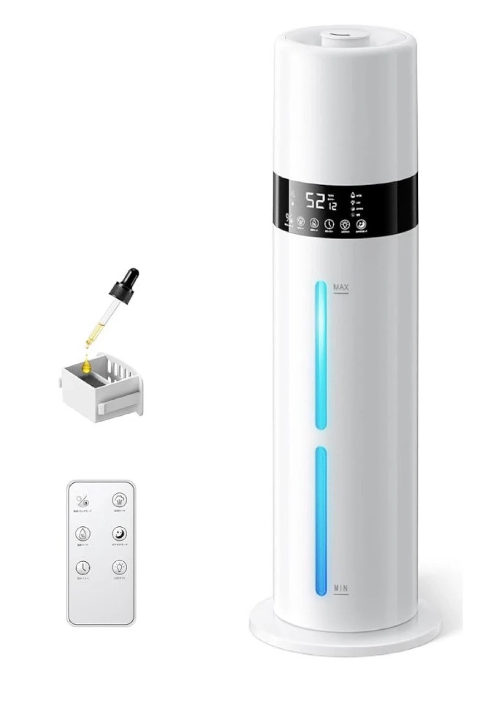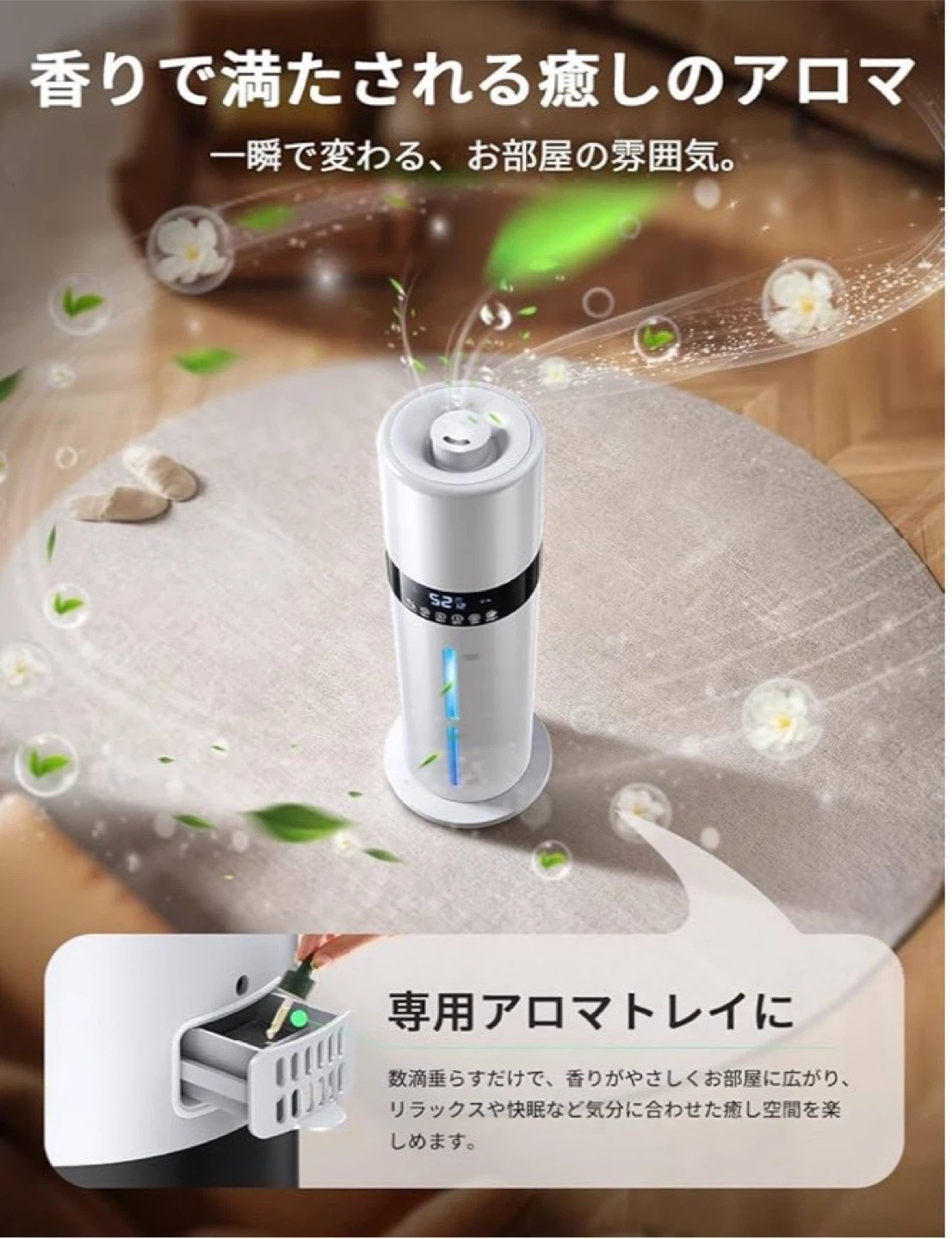 数ある中からご覧頂きありがとうございます(^○^) ◎✨️値下げ交渉◎✨️ ◎コメントなし、即購入大歓迎✧ ◎送料無料!安心の匿名配送 *。┈┈┈┈┈┈┈┈┈┈┈┈┈┈┈*。 ✨️\1品限り!!早い者勝ち!!/✨ ★商品説明★ 【上部給水 × 8L大容量×6〜35畳 手間いらずで毎日ラクに潤う】 重いタンクを持ち運ぶ必要がなく、上から水を注ぐだけの簡単設計となっております。8Lのちょうどよい大容量ですので、4Lタイプのように何度も給水する必要がなく、一方で13Lタイプのように水が長時間タンク内に滞留して臭いや雑菌が発生する心配もございません。6〜35畳までの空間をしっかり潤し、加湿しすぎによるカビや結露の心配も少ないです。 【銀イオン抗菌 × 次亜塩素酸水対応清潔ミストで家族の健康を守る】 タンク内部には銀イオン加工素材を採用し、水の中で発生しやすい雑菌の繁殖を抑制いたします。常にクリーンな状態を保ちながら、清潔なミストをお部屋全体に広げます。さらに次亜塩素酸水にも対応。 【湿度設定 × 自動停止 × 空焚き防止— 最適な空気環境を自分好みに】 液晶ディスプレイに現在の湿度が表示され、40〜90%の範囲で5%刻みの細かい設定が可能。設定湿度に達すると自動で運転を停止。過加湿を防ぎ、いつでも快適な環境を保ちます。タンク内の水がなくなると自動で運転を停止する空焚き防止機能をしており、過熱や故障の原因を防ぎ、安全にお使いいただけます。 【スリープモード×チャイルドロック機能 — 夜の静けさを守るやさしい加湿器】 動作音はわずか約24dBと、図書館よりも静かなレベル。スリープモードを設定すれば、表示ランプが自動で消灯し、暗い寝室でも光が気になりません。夜の静けさを保ちながら、朝まで心地よく潤いを届けます。乾燥による喉の痛みやお肌のつっぱり感をやわらげ、質の高い眠りをサポートいたします。さらにお子さまのいたずら操作を防ぐチャイルドロック機能を搭載。設定後はボタン操作が無効になり、誤ってモードを切り替える心配がございません。 【アロマ対応 × 7色LEDライト — 香りと光で癒しの時間を】 専用のアロマトレイに数滴垂らすだけで、お好みの香りがやさしくお部屋に広がります。7色に変化するLEDライトが加湿のミストと調和し、心がほっと安らぐ癒しの空間を演出。