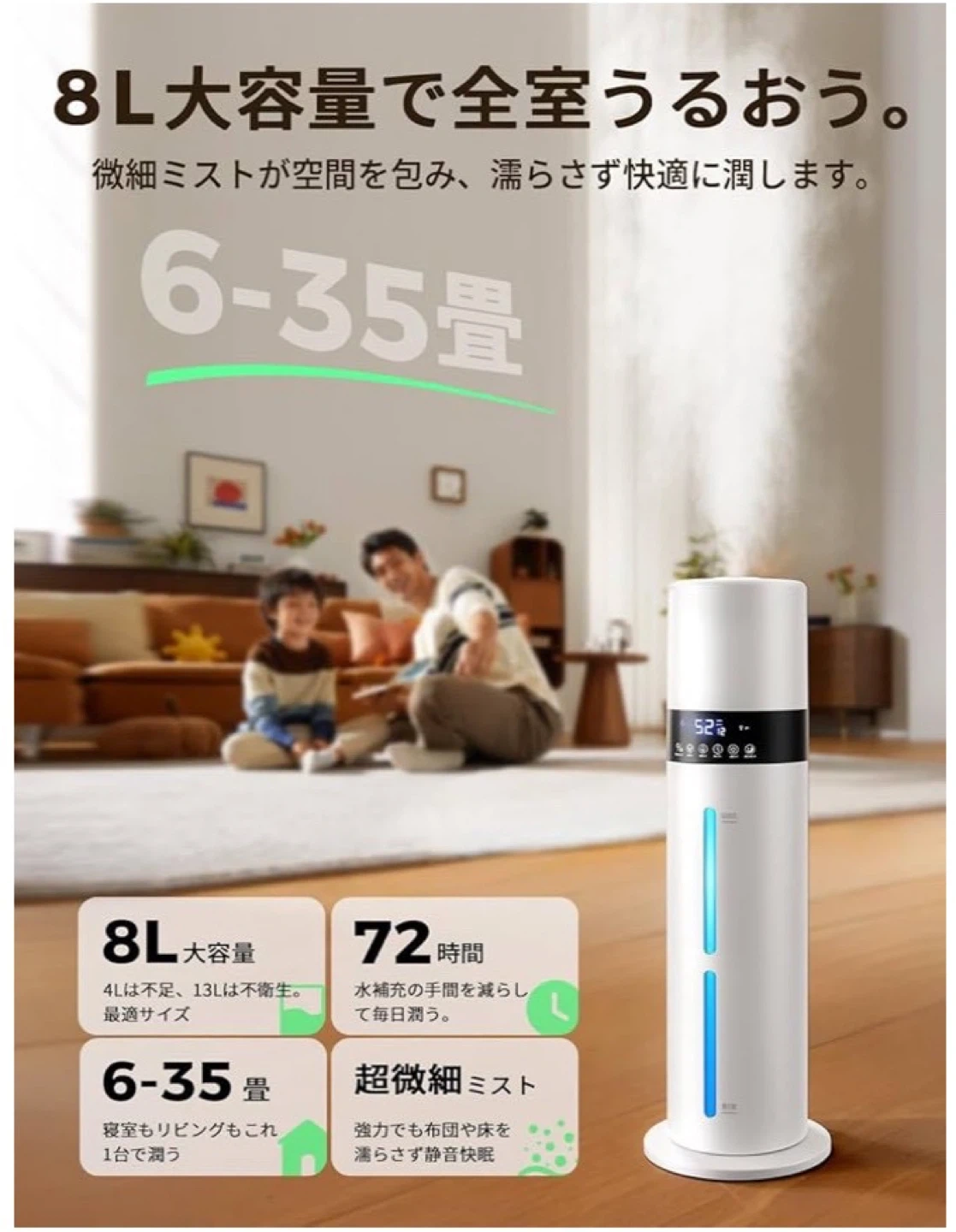 加湿器 大容量 8L 6~35畳対応 上から給水 タワー式 静音 超音波加湿器