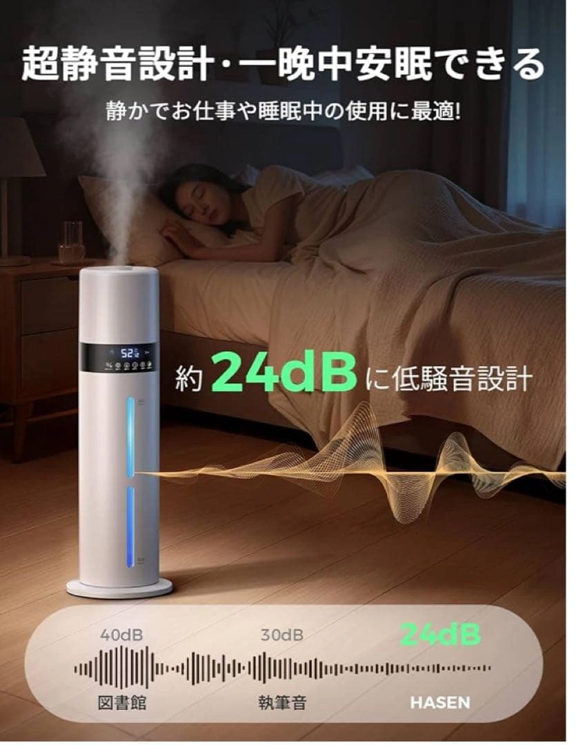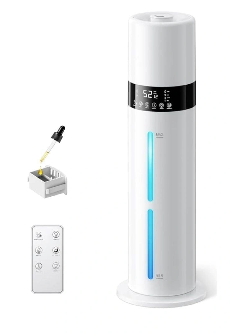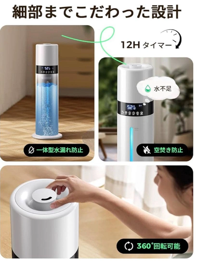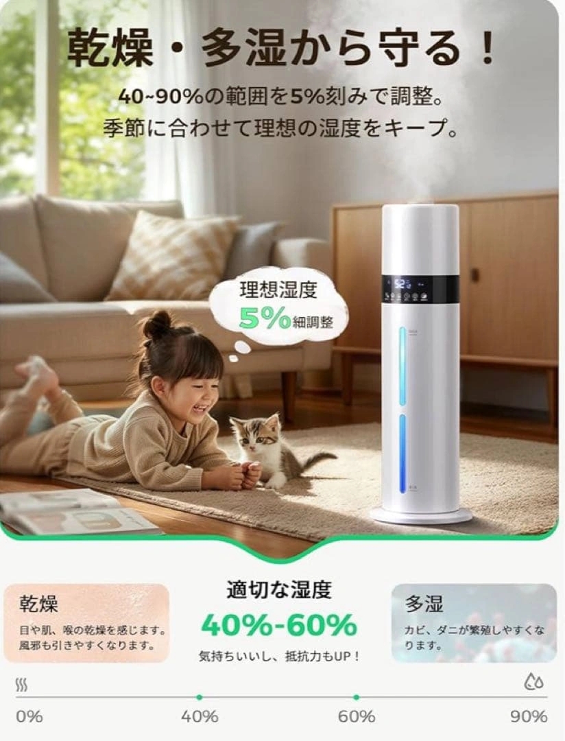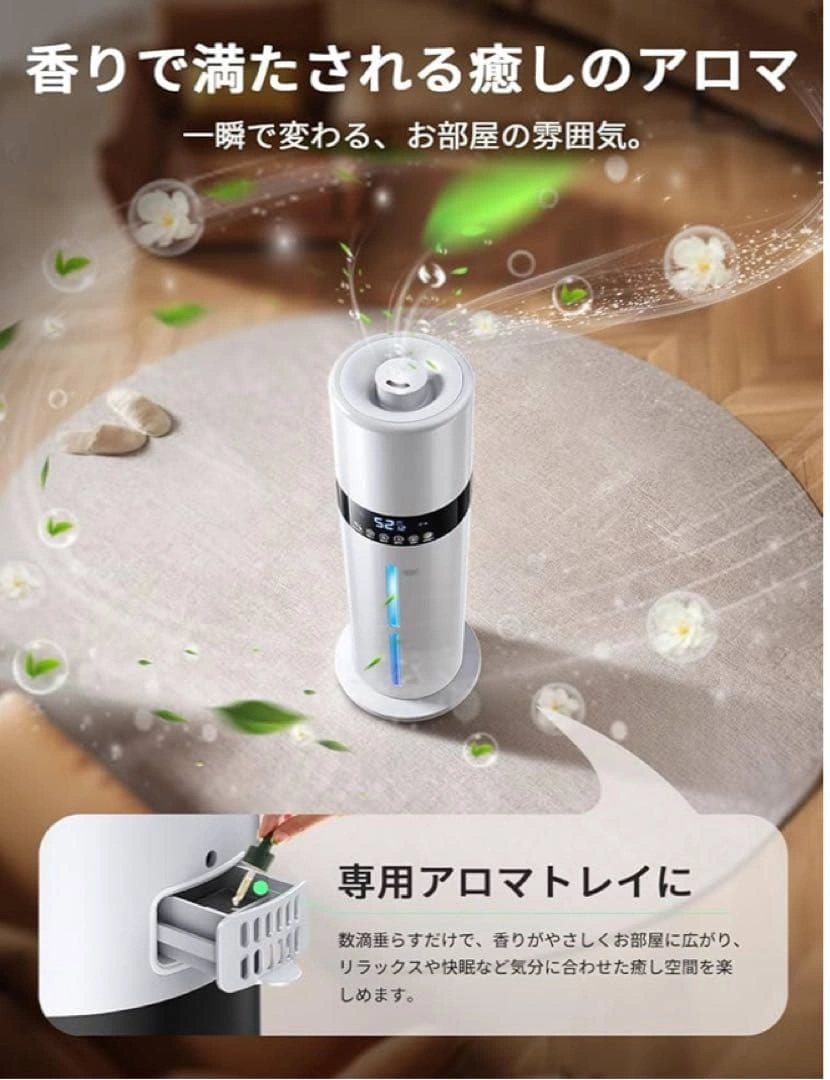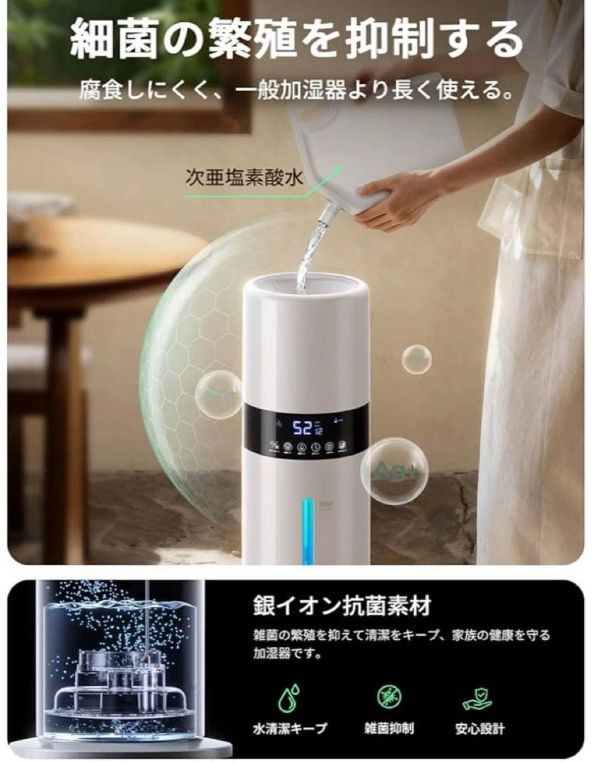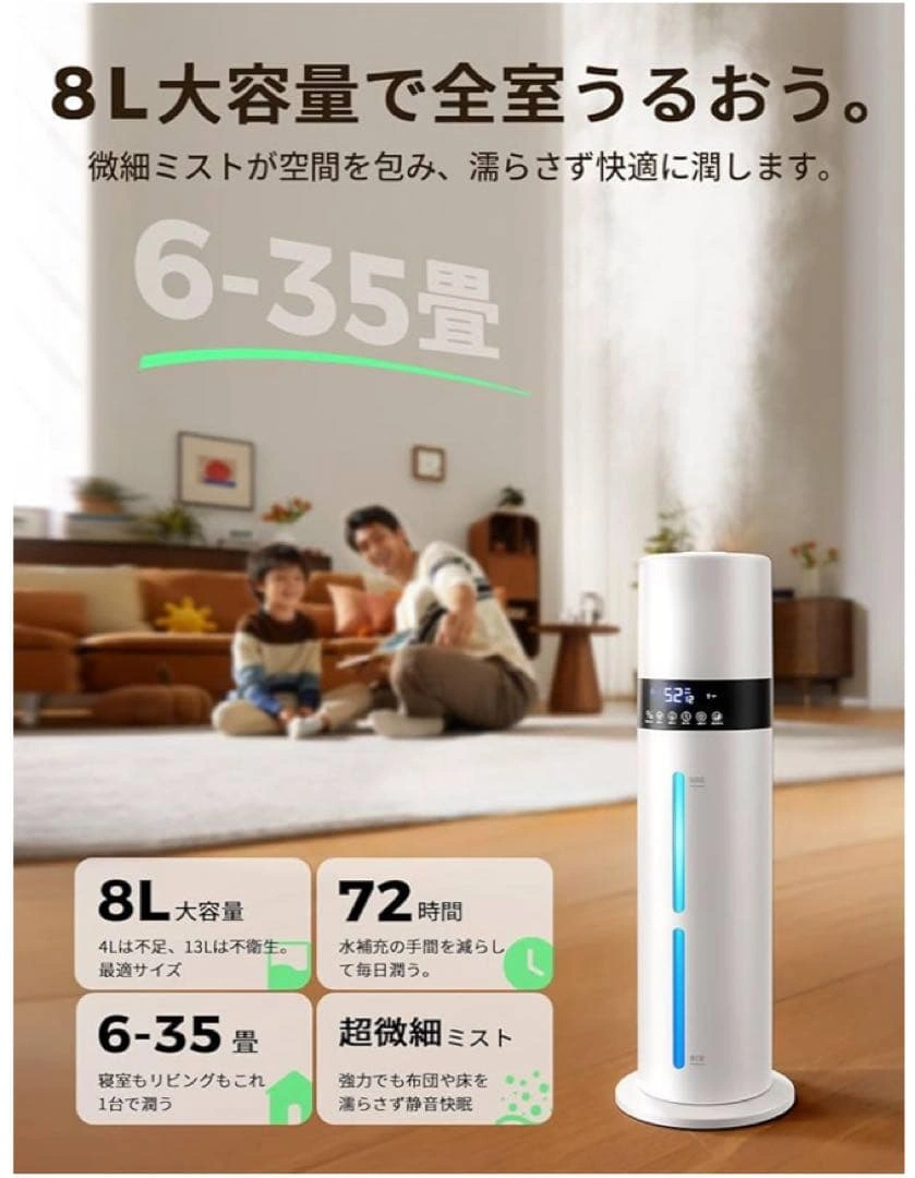 ご覧頂きありがとうございます。 【上部給水 × 8L大容量×6〜35畳 手間いらずで毎日ラクに潤う】 重いタンクを持ち運ぶ必要がなく、上から水を注ぐだけの簡単設計となっております。8Lのちょうどよい大容量ですので、何度も給水する必要がありません。6〜35畳までの空間をしっかり潤します。 【銀イオン抗菌 × 次亜塩素酸水対応清潔ミストで家族の健康を守る】 タンク内部には銀イオン加工素材を採用し、水の中で発生しやすい雑菌の繁殖を抑制いたします。常にクリーンな状態を保ちながら、清潔なミストをお部屋全体に広げます。さらに次亜塩素酸水にも対応。 【湿度設定 × 自動停止 × 空焚き防止— 最適な空気環境を自分好みに】 液晶ディスプレイに現在の湿度が表示され、40〜90%の範囲で5%刻みの細かい設定が可能。設定湿度に達すると自動で運転を停止。タンク内の水がなくなると自動で運転を停止する空焚き防止機能付きです。 【スリープモード×チャイルドロック機能 — 夜の静けさを守るやさしい加湿器】 動作音は約24dB。スリープモードを設定すれば、表示ランプが自動で消灯します。お子さまのいたずら操作を防ぐチャイルドロック機能を搭載。 【アロマ対応 × 7色LEDライト — 香りと光で癒しの時間を】 アロマトレイにお好みの香りを垂らすだけで、お部屋に広がります。7色に変化するLEDライトが加湿のミス トと調和します。 ご希望の方はお気軽にご連絡ください。