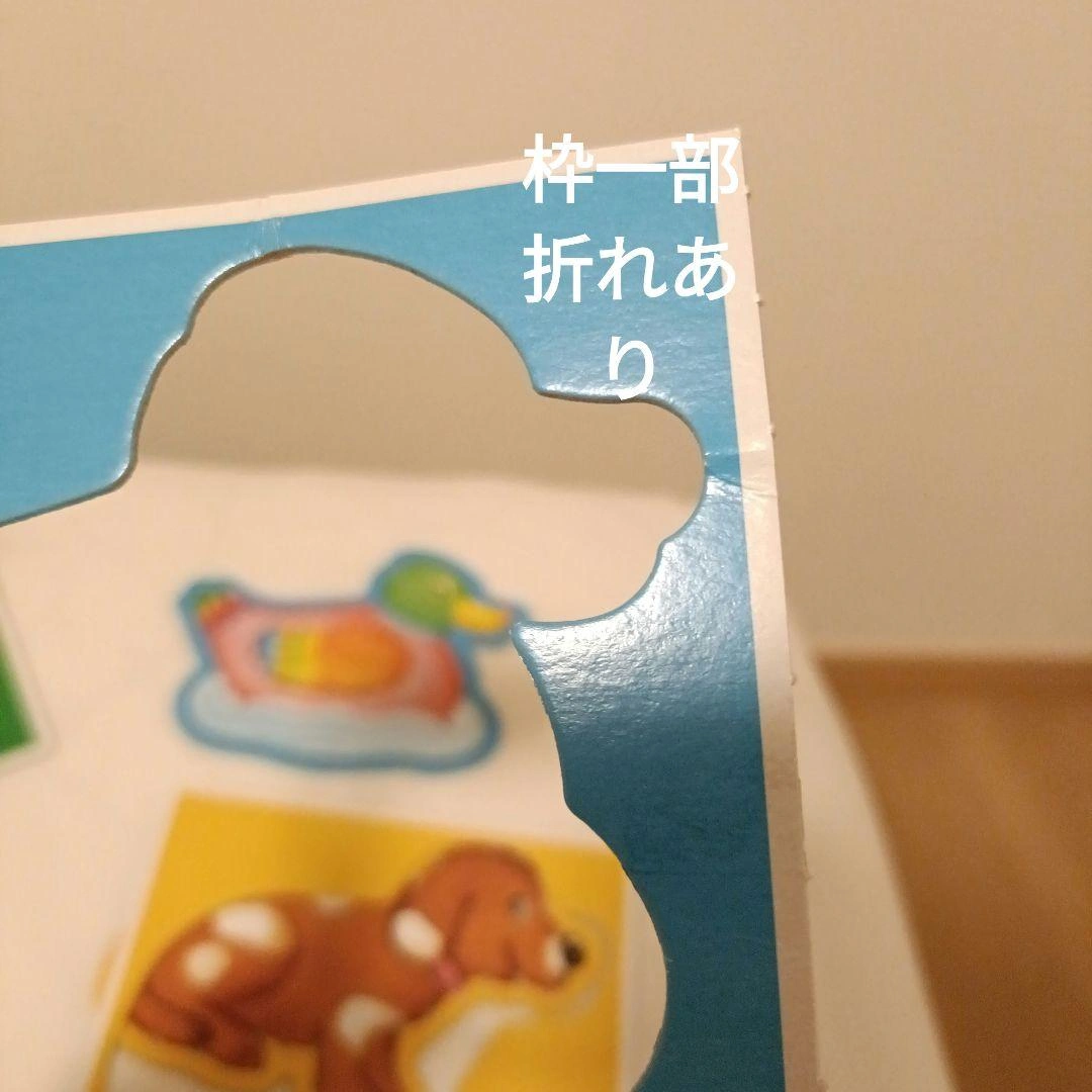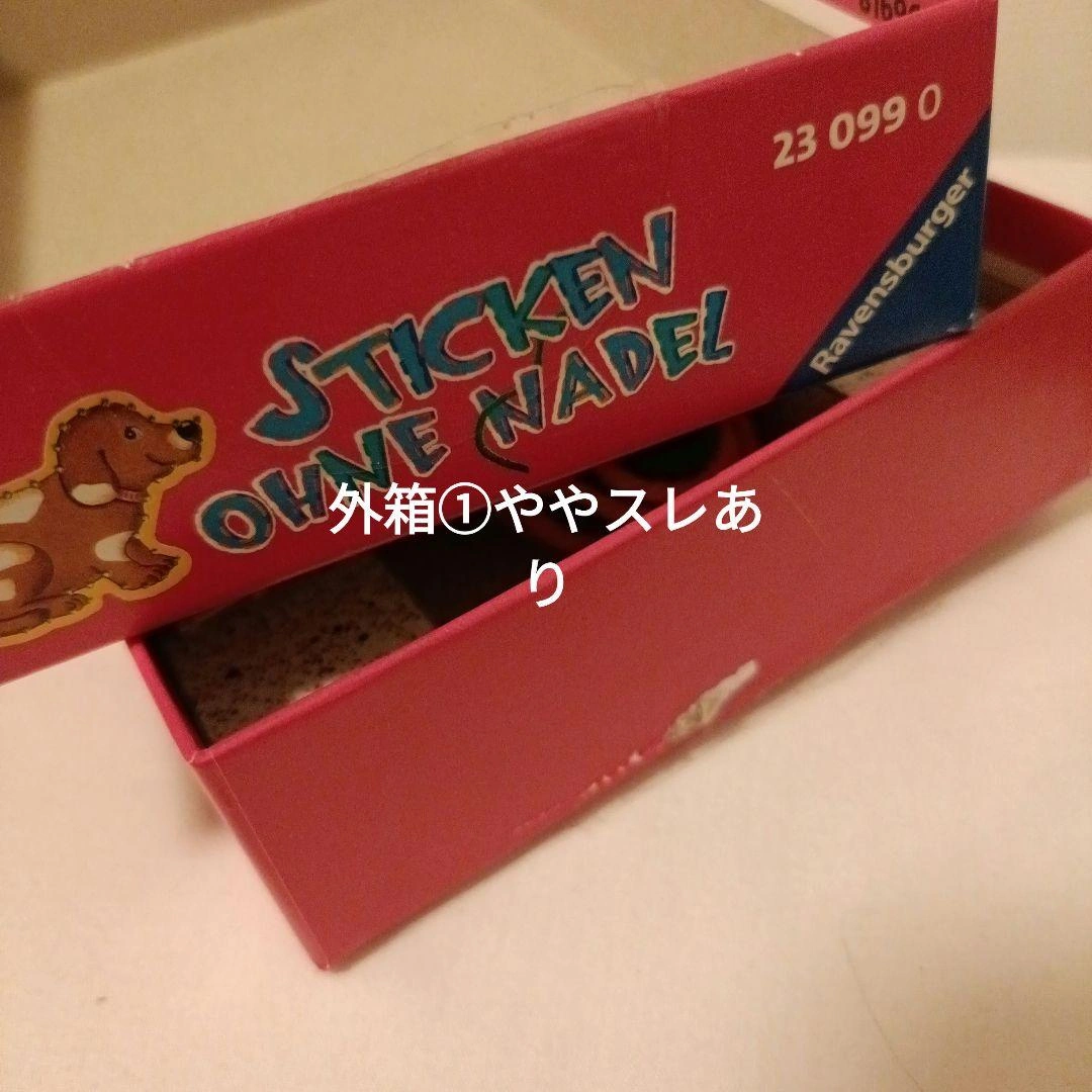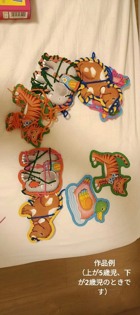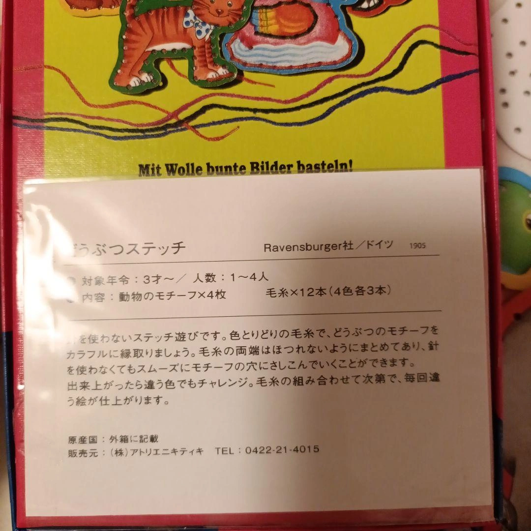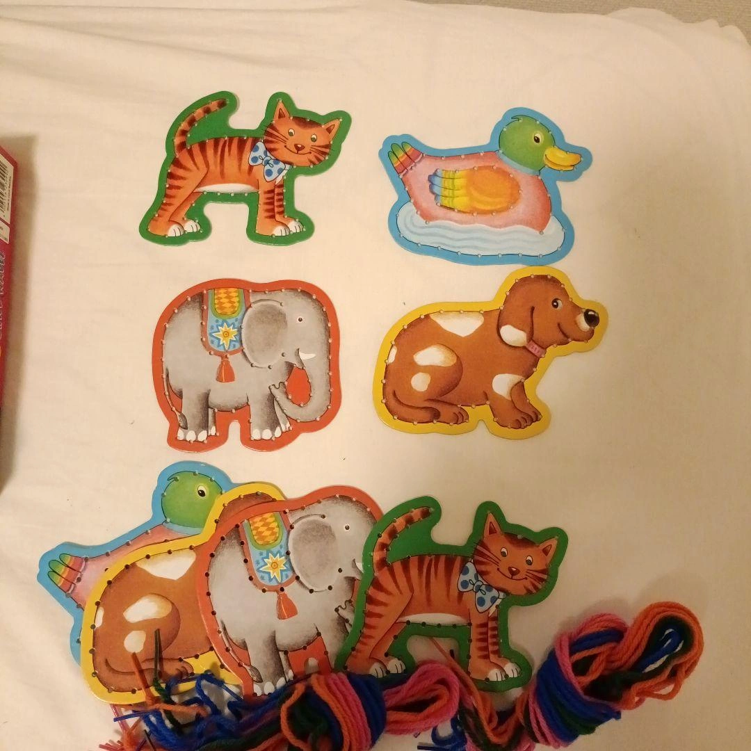 ドイツ製の動物の形をした厚紙のカードに糸を通して遊ぶ知育玩具です。 全てのパーツと毛糸揃っています。 似たおもちゃが複数ありうちの姉妹にはささらず1-2度使ってからすぐに暗所保管となりました。 一つ一つのカードが手のひらサイズでかさばらないため、出先でもオススメです。 2セットあるのですが、姉妹の色分けに裏面や端にそれぞれマステを貼っていたのですが、そのうちの一セットに紫のマステの色移りがよく見ると確認できます。 ベタつきなどはなく、そこまで目立つ感じではありませんが写真でご確認の上ご検討ください。 外箱の破れなども写真にいれています。 本来は捨てるはずの動物の外枠も子供が気に入っていたので捨てずに取ってありますが、1箇所だけ折れがありました。おまけでお考えください。 - セット内容: 動物の形をしたカード、毛糸  犬、猫、象、カモ - 対象年齢: 3歳以上 - 特徴: 穴が開いたカードに糸を通して遊ぶ知育玩具 紐通し、ひも通し、ひもとおし ご覧いただきありがとうございます。