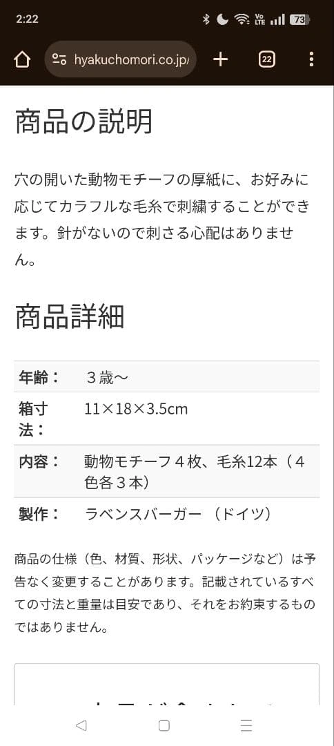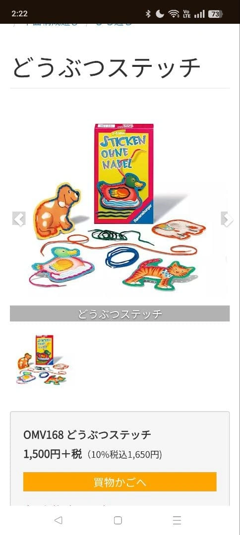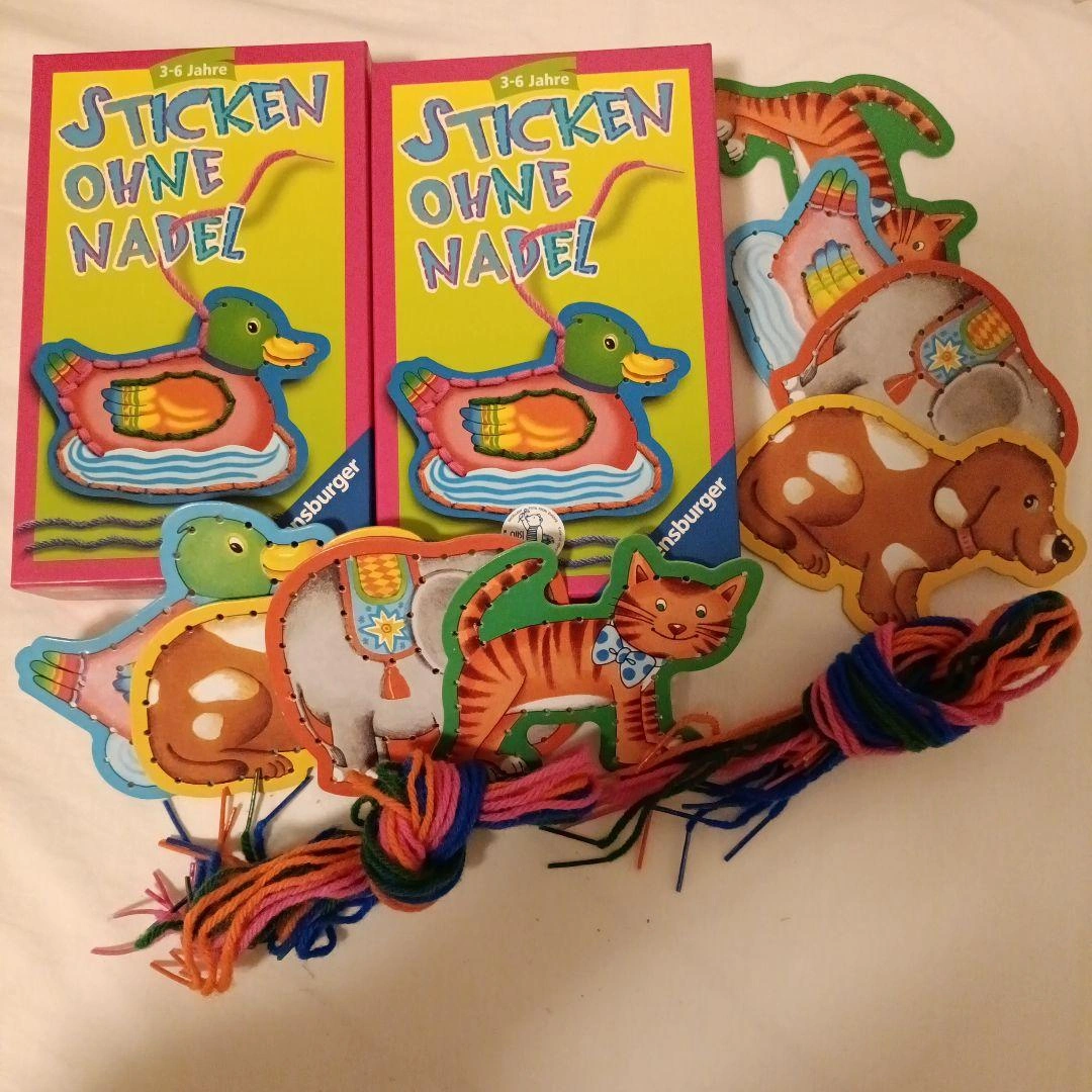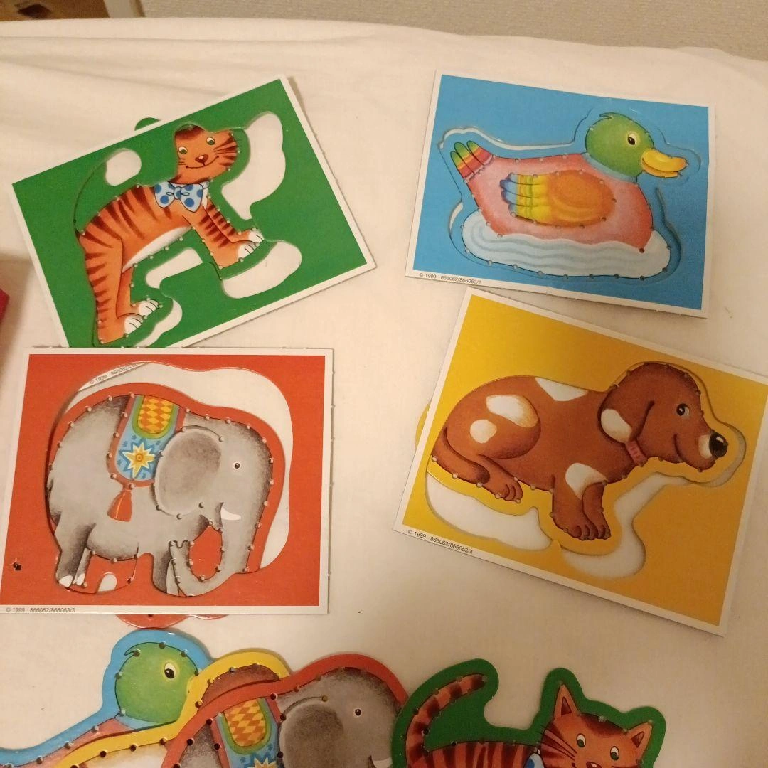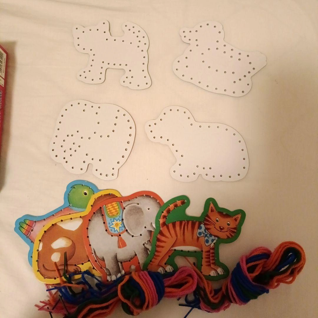 ドイツ製の動物の形をした厚紙のカードに糸を通して遊ぶ知育玩具です。 全てのパーツと毛糸揃っています。 似たおもちゃが複数ありうちの姉妹にはささらず1-2度使ってからすぐに暗所保管となりました。 一つ一つのカードが手のひらサイズでかさばらないため、出先でもオススメです。 2セットあるのですが、姉妹の色分けに裏面や端にそれぞれマステを貼っていたのですが、そのうちの一セットに紫のマステの色移りがよく見ると確認できます。 ベタつきなどはなく、そこまで目立つ感じではありませんが写真でご確認の上ご検討ください。 外箱の破れなども写真にいれています。 本来は捨てるはずの動物の外枠も子供が気に入っていたので捨てずに取ってありますが、1箇所だけ折れがありました。おまけでお考えください。 - セット内容: 動物の形をしたカード、毛糸  犬、猫、象、カモ - 対象年齢: 3歳以上 - 特徴: 穴が開いたカードに糸を通して遊ぶ知育玩具 紐通し、ひも通し、ひもとおし ご覧いただきありがとうございます。