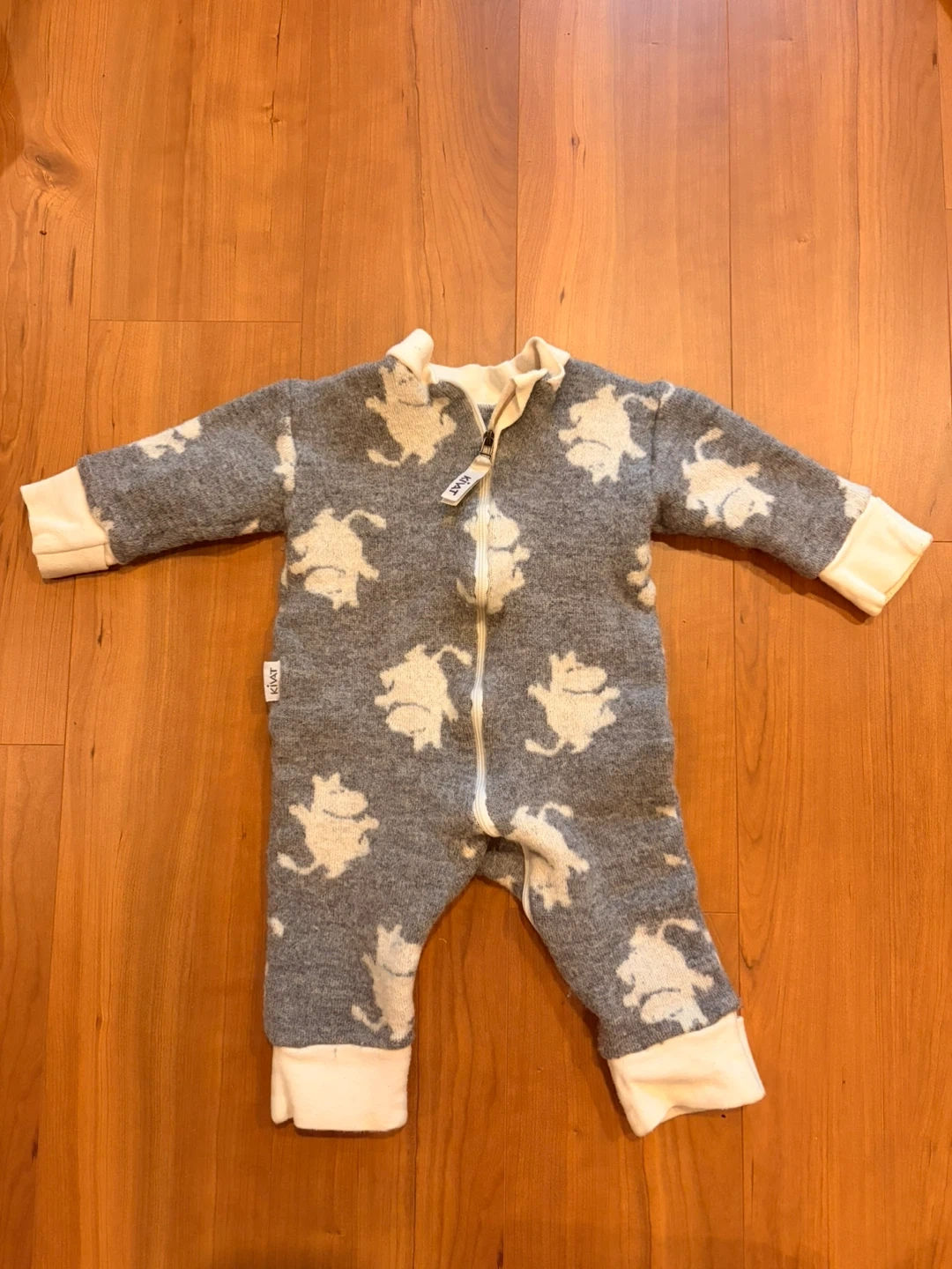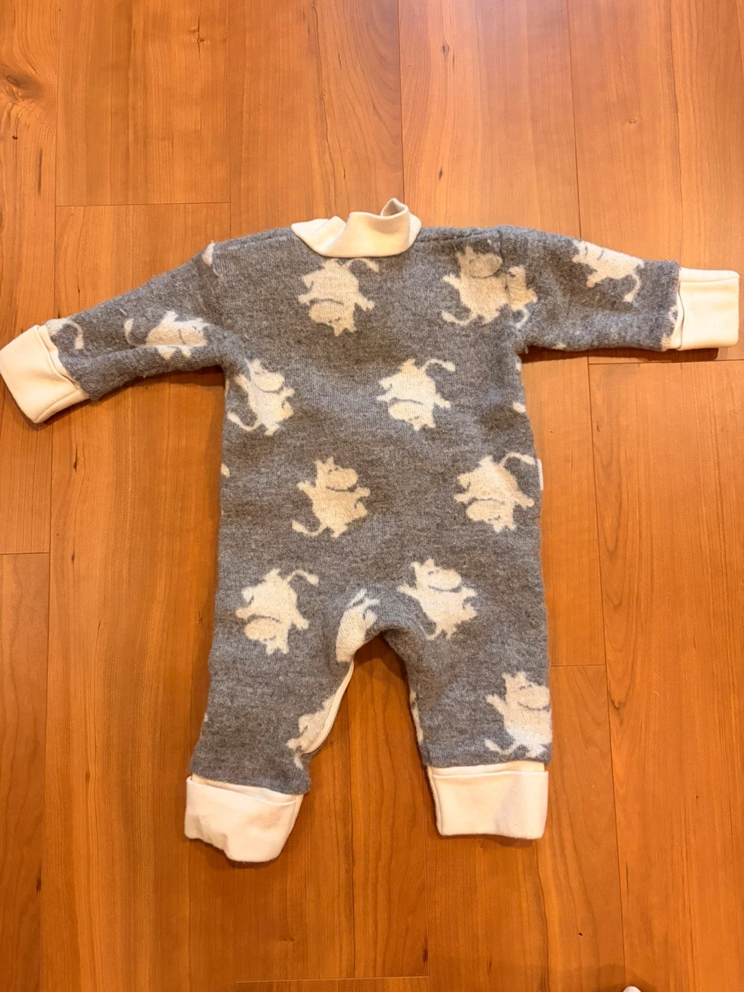 ムーミンのベビー服です。 ・ブランド:ムーミン KIVAT ・種類:ロンパース ・素材:ウール100% ・サイズ:70 (やや小さめです) ・色:グレー、ホワイト ・状態:目立った汚れなし ムーミンのベビーボックスに入っていました。ホームクリーニング、中古品であることをご了承ください。