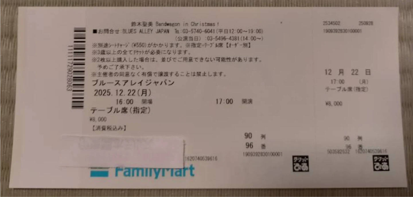ライブチケットです。 予定ができて行けなくなったので差し上げます。 2枚あります。値段は1枚での価格です。 ・イベント名:鈴木聖美 Bandwagon in Christmas! ・会場:BLUES ALLEY JAPAN ・日付:2025年12月22日(月) ・開場:16:00 ・開演:17:00 ・席:テーブル席(指定) ・料金:¥8,000 ・列:90列 ・番号:96番 ご不明点があればお気軽にお尋ねください。