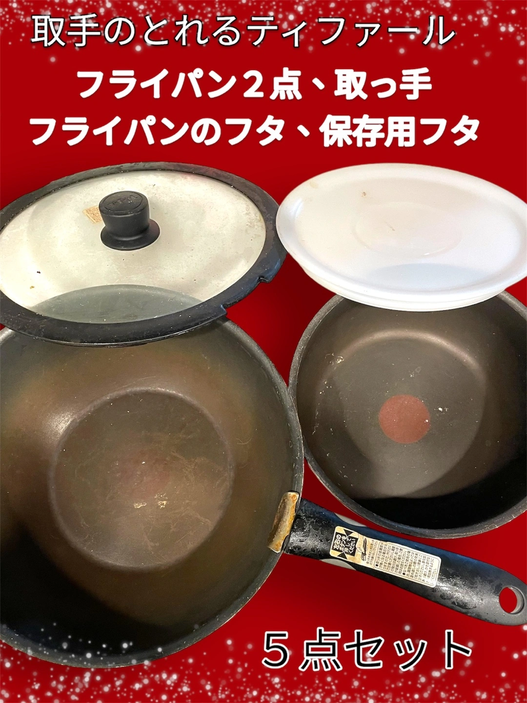 【多用途の調理器具】 フライパン大中2点とフタ、取っ手、保存用フタの5点セットで、様々な料理に対応可能です。 【使用感のあるデザイン】 使用感があり、独特の風合いを持つフライパンは、家庭料理にぴったりです。 【収納に便利】 保存用フタが付いているため、料理の保存や持ち運びにも便利です。 - セット内容: フライパン2点、取っ手、フライパンのフタ、保存用フタ - 状態: 使用感あり、傷や汚れあり - サイズ: フライパン大の直径26〜28cm 深さ約9cm フライパン中の直径20〜22cm 深さ約8cm - 素材: 金属製 ご覧いただきありがとうございます。 喫煙者はおりません。ペットは飼っていません。 かなり使用感はあり、摩耗していて傷、汚れ、ベタつき、こびりつき、焦げつ きがあります。 まだ使えるためずっと保管しておりましたが、使わないため出品いたしました。 取手のとれるを使ってみたい方、お試ししてみたい方ぜひどうぞ。 傷や汚れ等、写真に撮りきれないくらいございますが、状態が悪いことよくご確認いただき、中古品、自宅保管ご理解いただける方お願いします。