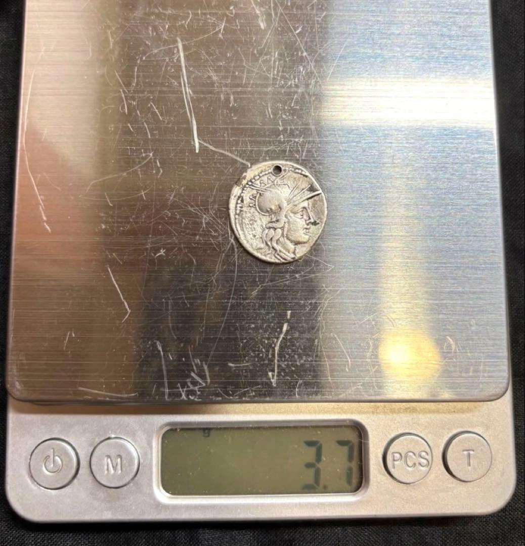 ご覧いただきましてありがとうございます。 古代ローマ時代(紀元前100年頃)の デナリウス銀貨と思われます。 表に女神ローマ、裏に四頭立ての戦車クアドリガと「M·TVLLI」の刻印があります。 ✴︎重量:約3.7g(写真あり) ✴︎直径:約20mm(写真あり) ✴︎磁石に反応なし ✴︎エッジは打刻のようです(鋳造ラインなし) 鑑定書はございませんが、重量・打刻痕などから本物の古代銀貨と思われます。 上部に穴がありペンダント加工されている為、アクセサリーとしても素敵です。 アンティーク好きの方やローマコインコレクターの方におすすめです。 家族が長期自宅保管していたもので、経年による黒ずみが若干ございます。 状態は画像をご確認のうえ、ご納得いただいた上でご購入ください。 記載以外の情報は持ち合わせておりません。 キャンセル、返品、商品お受け取り後のクレームはご遠慮ください。 ご希望の方はお気軽にご連絡ください。