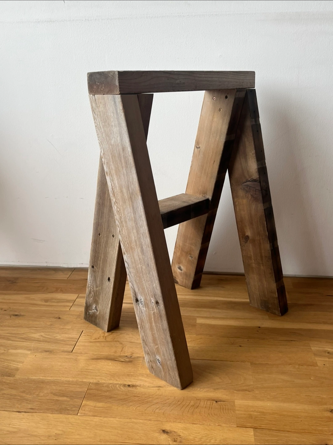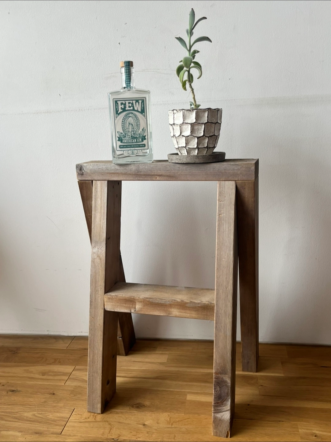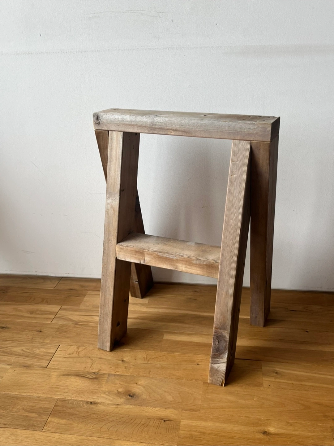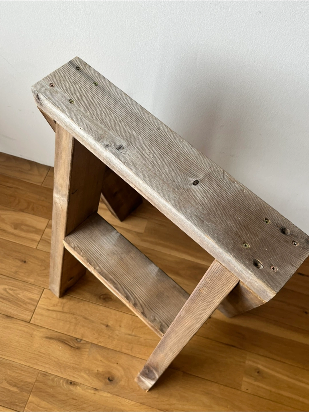 古材のシンプルなデザインのスツール、ディスプレイ棚になります。丁度いい高さで座りやすいです。外でのガーデニングのアクセントに使ってもいい感じです。ご自身でアレンジ楽しんでくださると幸いです。 横幅42cm 高さ57.5cm 棚の幅8.5cm 古材利用の為、元々あった穴などは空いている部分がございます。 ご理解ある方のみご購入ください。 一枚目の写真の物は付きません。スツールのみです。