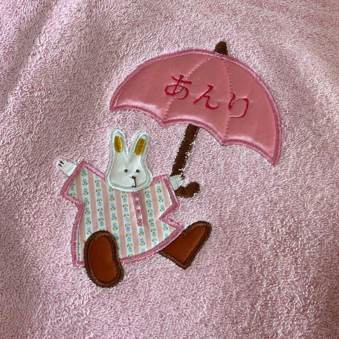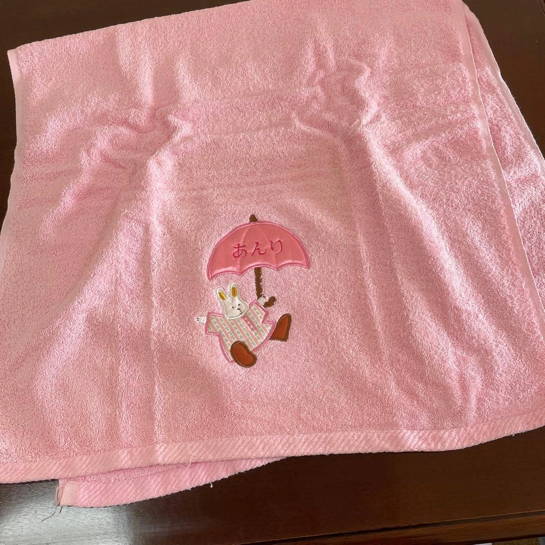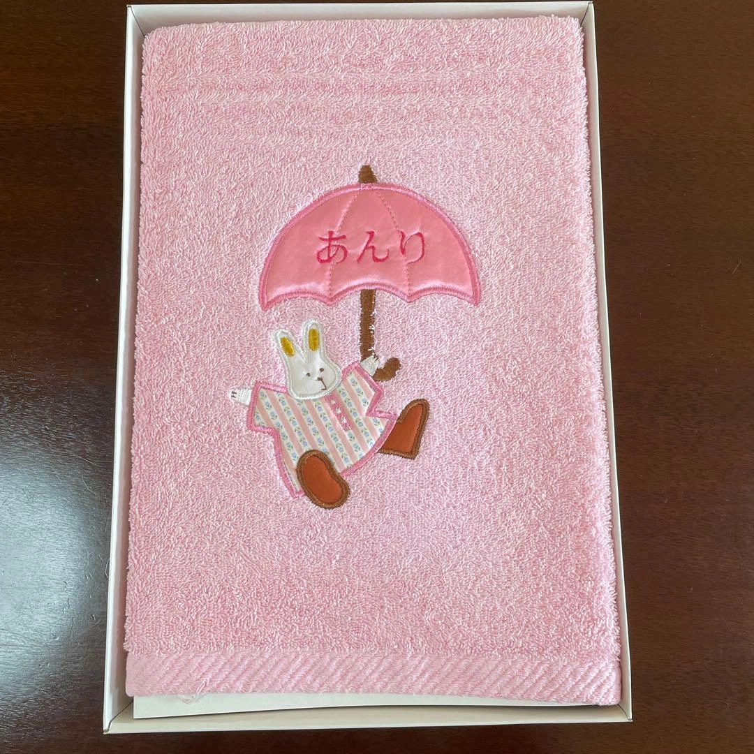 綺麗なピンク地にパラソルを持ったうさちゃんの可愛らしいタオルです。 【あんり】の名前入りです。 あんりちゃんいかがですか? 箱に入れたまま保管しておりました。 サイズ:約122×62cm ご希望の方はお気軽にご連絡ください。