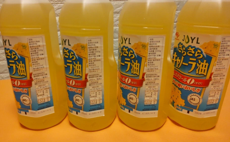 ご覧頂きまして、有難うございます。 JOYL さらさら キャノーラ油 1000g✖️4本 賞味期間 2026年3月…1本 2026年4月…3本 ●サラッとした軽いおいしさが楽しめるキャノーラ油です。 ●ドレッシングといった生で使う用途はもちろん、揚げ物、炒め物など、幅広く使えます。 ●コレステロール0 【品名・名称】 食用なたね油 【JOYL さらさら キャノーラ油 ペット コレステロール0の原材料】 食用なたね油(国内製造) 【栄養成分】 大さじ1杯14gあたり エネルギー:126Kcal、たんぱく質:0g、脂質:14g、飽和脂肪酸:0.7~1.1g、コレステロール:0mg、炭水化物:0g、食塩相当量:0g、飽和脂肪酸含有割合:5~8% 【保存方法】 常温、暗所保存 【注意事項】 ・油は加熱しすぎると発煙、発火します。その場を離れないでください。 ・加熱した油に水を入れないでください。 ・プラスチック容器に熱い油を入れないでください。 ・開封後はなるべく早めに(1-2ヶ月)ご使用ください。 ・油は流しに捨てないでください。 ※キャノーラ油となたね油は同じものです。 【原産国】 日本 【ブランド】 味の素 J-オイルミルズ 本数の変更も致しますので、ご希望の方は コメントからよろしくお願い致します。