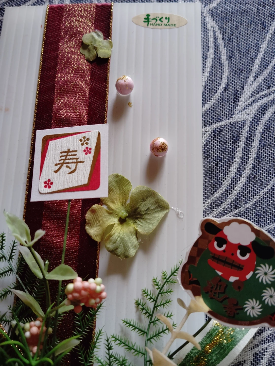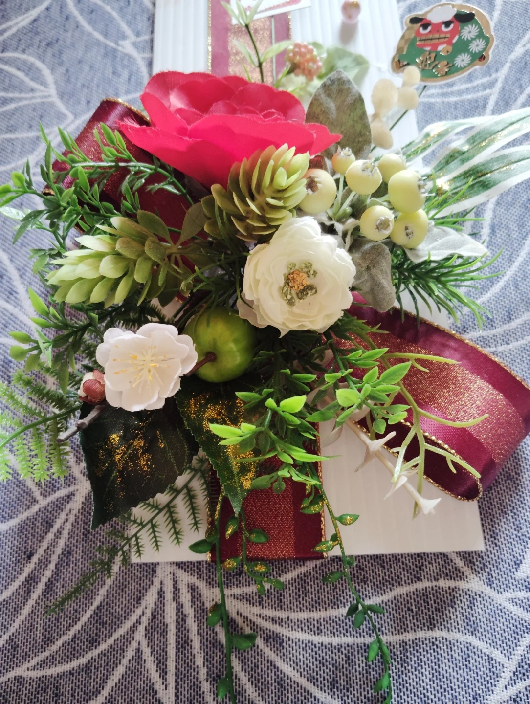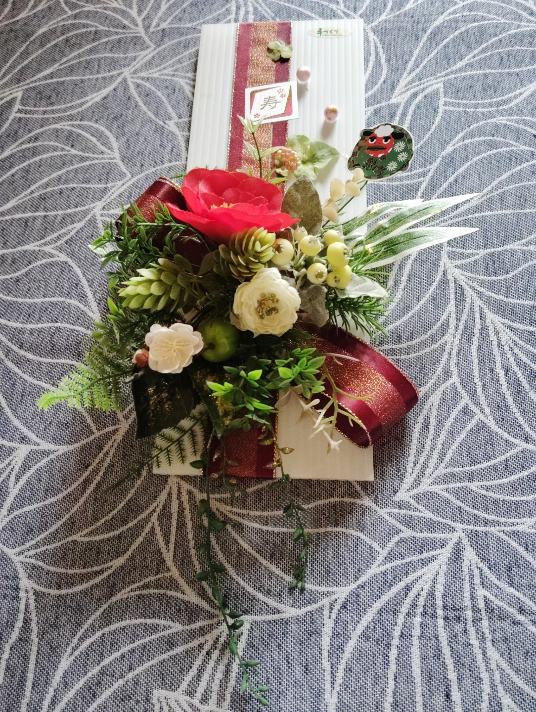 洋を感じる正月壁掛けです。ワイン色のリボンに椿、松、ラナンキュラス、ベリーピックのあしらいが特徴です。毎年の飾りをお勧めします。*未使用ですが若干の色落ちがあります。気になる方はお避け下さい。 正月用飾り物です。 ・赤と白の花、緑の葉、赤いリボンなどを使った飾り ・サイズ(約)全長44 横幅24 奥行10センチ ご不明点があればお気軽にお尋ねください。