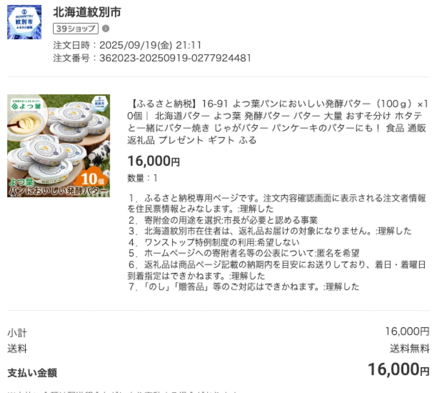 ふるさと納税で今週金曜(12月5日)に届いてもらいましたが、バターもちょうど同じ時期にたくさん知りありからもらってしまい、、、こちらをキャロットで出品します。 保管:金曜もらった時、冷凍しておきました。お渡す際に、保冷バッグご持参していただけますと助かります! 状態:10個全部未開封のものになります。 価格:スーパーだと1個400円前後ですが、10個まとめて3,300円でお譲りします。 よろしくお願いいたします✨