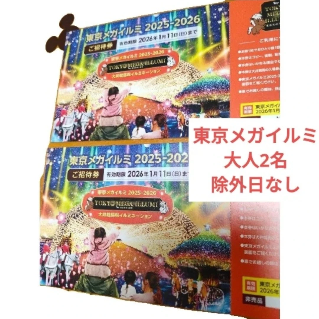 東京メガイルミ2025~26 無料ご招待券2枚 期間中いつでも使える大人2枚チケットです。 こちら2枚セットのお値段です。 徐外日は無く全日利用可のチケットです。 入場券タイプ:ご招待券 イベント名:東京メガイルミ 大井競馬場イルミネーション 開催期間:2026年11月1日~2026年1月11日 営業時間:16:30-21:00 料金:1000~1600円(大人)、500~900円(小学生以上) 日にちで値段は変動しておりすが、こちら1枚でお1人様入れます。 場所:大井競馬場 - 枚数:2枚 大井競馬場  イルミネーション イベント ベビタピ ロディ キミとアイドル  プリキュア ナンバーワン戦隊  ゴジュウジャー おジャ魔女どれみ 仮面ライダー ゼッツ ウルトラマン オメガ シナモロール シナモン ポムポムプリン サンリオ JAPAN MEAT FES 小島よしお