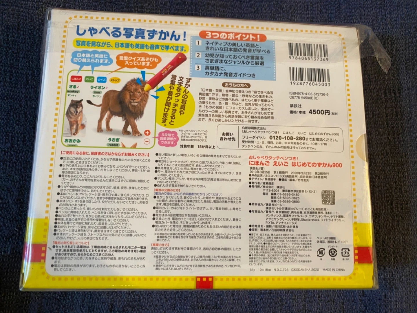 講談社のはじめての図鑑です タッチペンを使って写真に触れると、 日本語と英語で話してくれます(^^) せっかく購入したのですが、 他の教材を気に入ってしまい 2.3回の使用となってしまい大変備品です! 電池での作動確認済みです。 (電池を入れたままお渡しします) 【情報】 商品名:はじめてのずかん900 ブランド:キッズデザイン 定価:4,500-(税込4,950-) 【状態】 使用感少なめ(殆ど使用しておりません) 【付属品】 タッチペン 中古品であることご了承ください