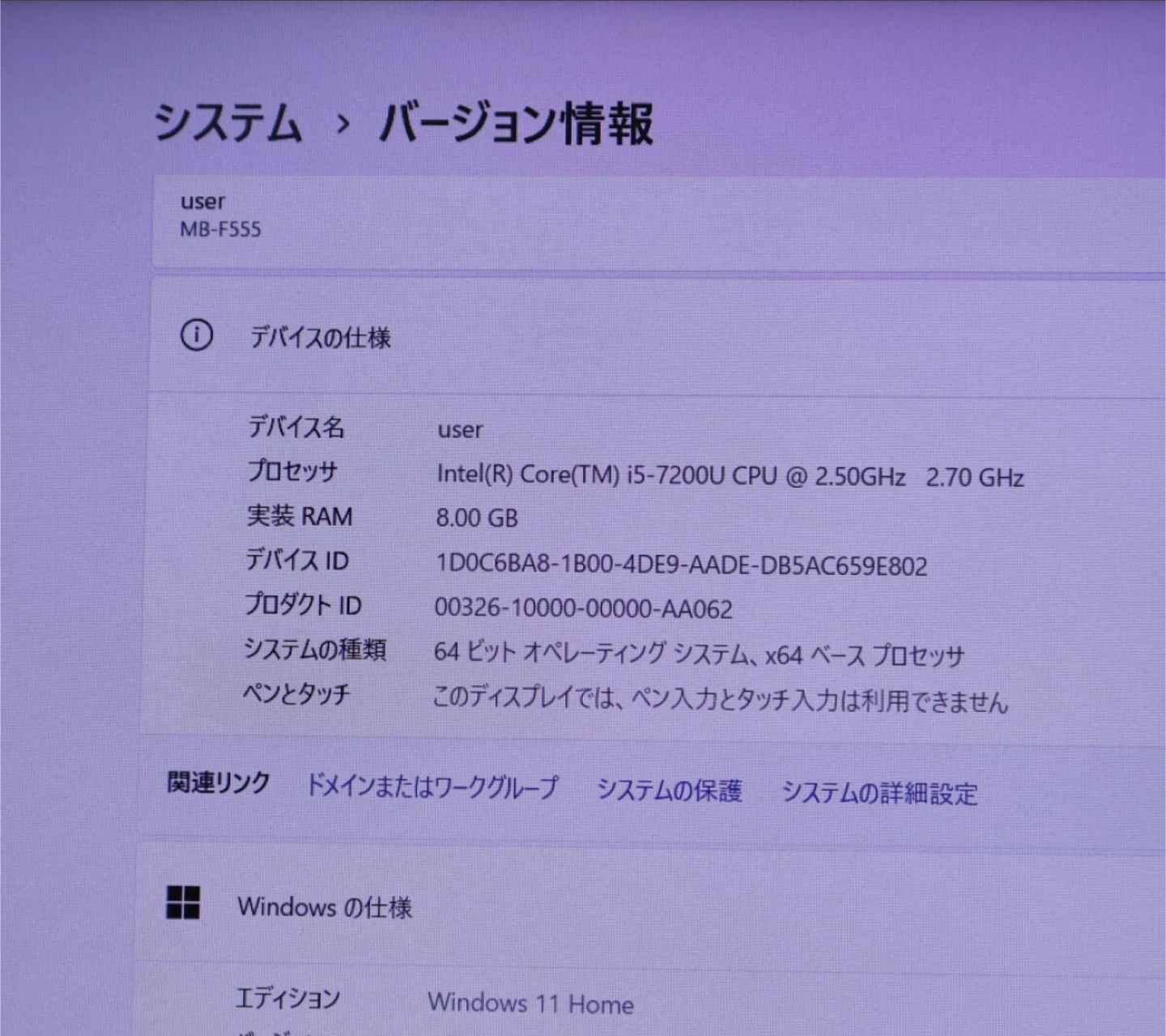 ★中古パソコン★ 中古パソコンネットショップ。パソコン初心者の方でも安心してお得に使って頂く為に、困った時に助けられるお客様サポートに力を入れている ①office2024認証済み ② AIエディタCursor のインストール、日本語設定方法付ける ③ PDF新規、編集、等等最強ツール、永年無料 ★商品詳細★ 商品名:MouseComputer MB-F555SN1 OS:Windows11 64bit CPU:Intel Core i5 7200U (KabyLake) 2.50 GHz 最大3.10 GHz 7世代デュアルコア(2コア)4スレッド 高性能CPU♪ メモリ:新品8GB 記憶装置:高速SSD256GB+HDD1TB 液晶:15.6型 通信:有線LAN、無線Wi-Fi 【光学ドライブ】DVDスーパーマルチドライブ 「動作確認」 ・USB3.0ポート OK ・イヤホンジャック OK ・キー /テンキー OK ・タッチパッド OK ・Webカメラ OK ・有線LAN/無線LAN OK ・HDMI OK ・バッテリー充電 OK 健康 ※ 消耗品の持ち時間は保証の対象外 ★こんな所が良いポイント★ ・office2024認証済みおよび常用ソフトが無料で付属 ・面倒な初期設定不要で、届いてすぐ使える! ・困った時の親切丁寧な無料サポートあり ・到着から3日間は返品可能なのでお試しでもOK 【天板】非常に良好です 【キーボード】非常に良好です 【パームレスト】非常に良好です 【ディスプレイ】非常に良好です 【ヒンジ】非常に良好です 【底面】良好です。細かいキズある バッテリー充電 OK 健康 ※ 消耗品のため保証対象外です。持ち時間は保証対象外。 ※ACアダプタは在庫によって純正メーカーではない場合がありますが、電力規格に合ったものですので安心して使用してください。 ※ 欠点:なし ※ご自分持っているパソコンは下記の困った時、親切丁寧なサポートがあり、ごコメントお願いいたします。