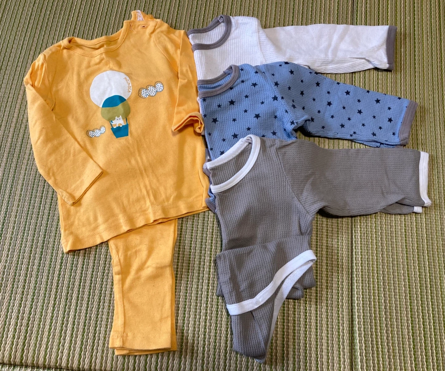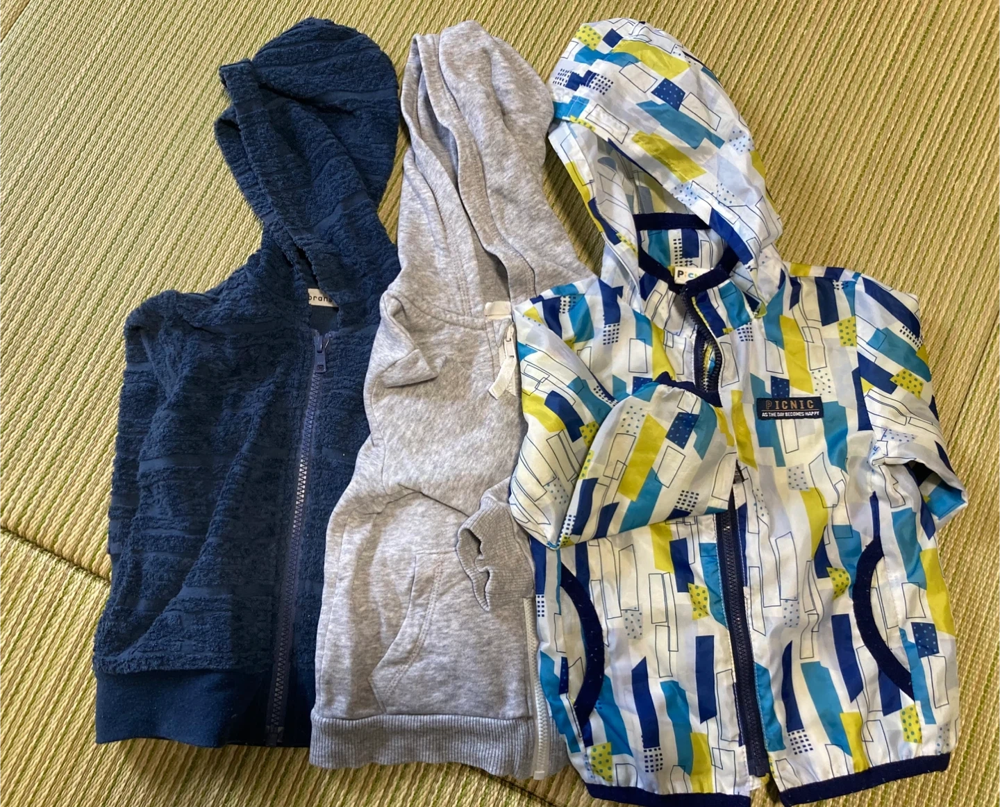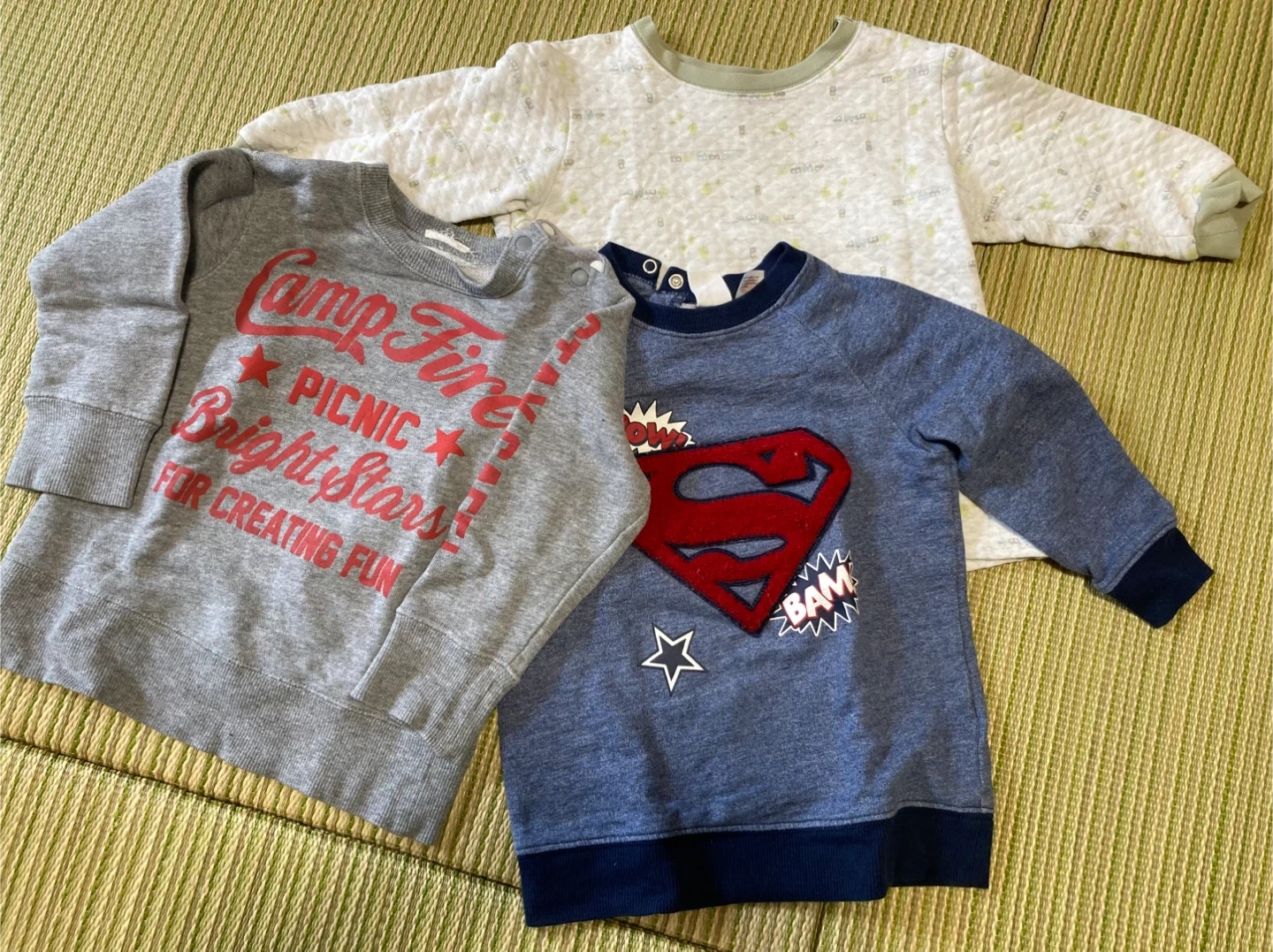 90サイズがメインですが、大きめ80や小さめ95も入っています。 全て同じ時期に着たものです。 コムサやミキハウス(picnic)、ブランシェス、ユニクロ、ブリーズ、等も一部入っています。 大きな汚れや破れなどはありませんが、子供が着用したもので毛羽立ちや毛玉、少し引っかかりの糸が出ている箇所などあります。 お名前シールは剥がし、タグの記名はそのままにしています。 一部ズボンのポケットが少しほつれていますが、そのままのものがあります。(写真3枚目左から2本目) 裏起毛のレギンス、スウェット、長ズボン、薄手のカーディガン、パーカー付きウインドブレーカー、長袖Tシャツ、トレーナー、ベスト、パジャマ、長袖ロンパースなど合計29点になります。 以上の点、ご了承のほどよろしくお願いいたします。