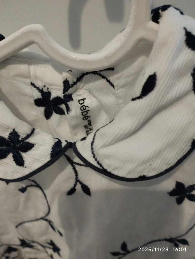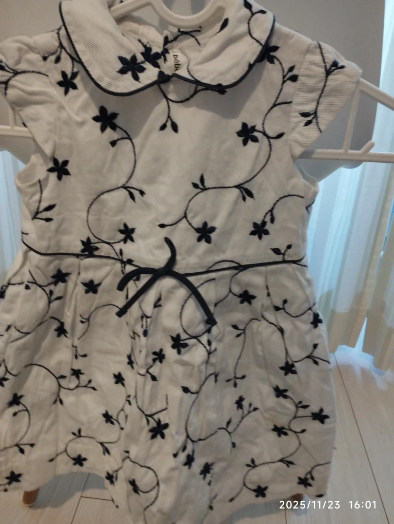 ベベのベビー服ワンピースです。 ・ブランド:ベベ ・色:白地に黒の花柄 ・デザイン:襟付き、リボン付き ・状態:目立った傷や汚れなし 中古品であることをご了承ください。