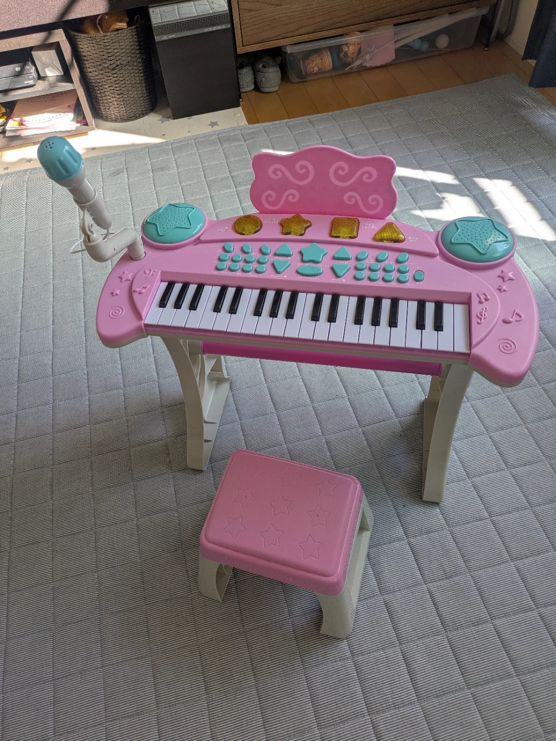 子供用の電子ピアノで椅子が付いたものです。 主に2才〜3才頃に遊んでいましたが、 もう少し鍵盤数が多いものを買ったので 不要となったこちらを出品します。 ※全ての音が出ており、マイクも使えます。  うちはマイクのコードを挿さずに使っていたので  はじめからそういうものなのか、途中から  そうなったのか分からないのですが、  マイクのコードを挿すと軽い電子音がします。 1音ずつ引くのは問題ないのですが 元々の仕様でニ音以上の和音は鳴らせないので、 小さい子の玩具用です。