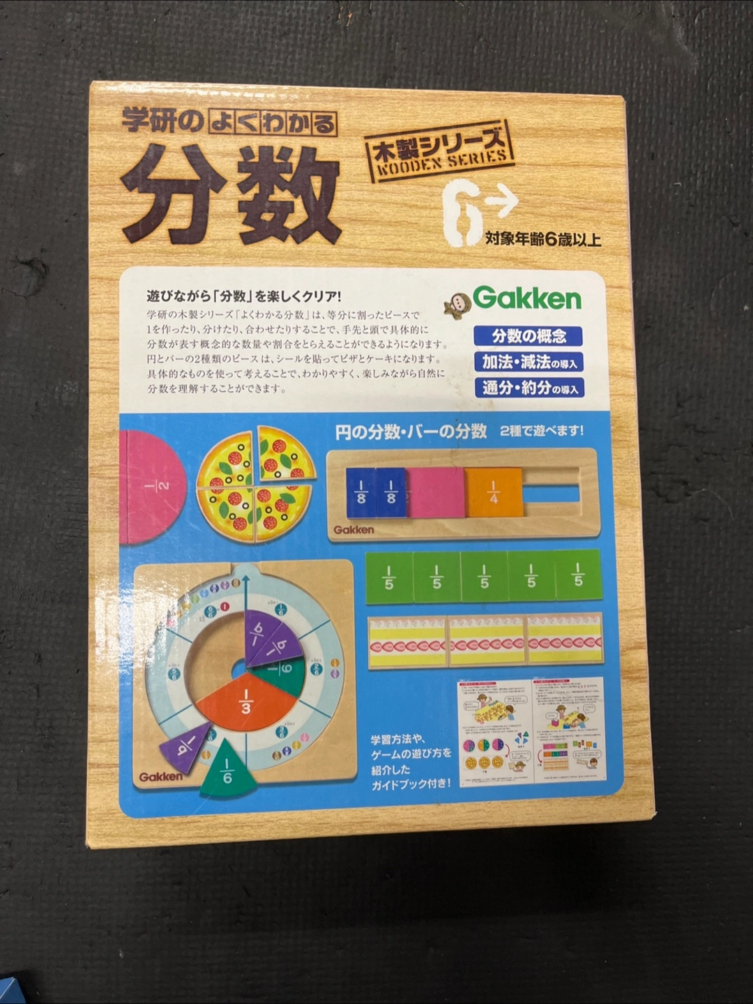 ・木製シリーズ ・対象年齢:6歳以上 ・分数の概念、加法・減法の導入、通分・約分の導入 中 古ですので、神経質な方はご遠慮下さい。