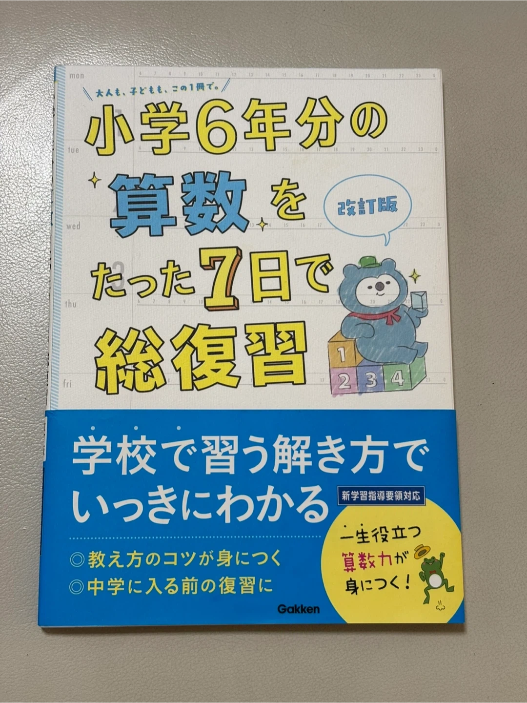 小学6年分の算数をたった7日で総復習」改訂版 Gakken(学研)の復習本です。 小学校6年間で習う算数が、7日間で効率よく学べる内容になっています。 図解やポイントがわかりやすく、子どもから大人の学び直しまで使えます。 中のページに書き込みはありません。 カバー・ページの状態は写真をご確認ください。 中古品に理解のある方のご購入をお願いします。