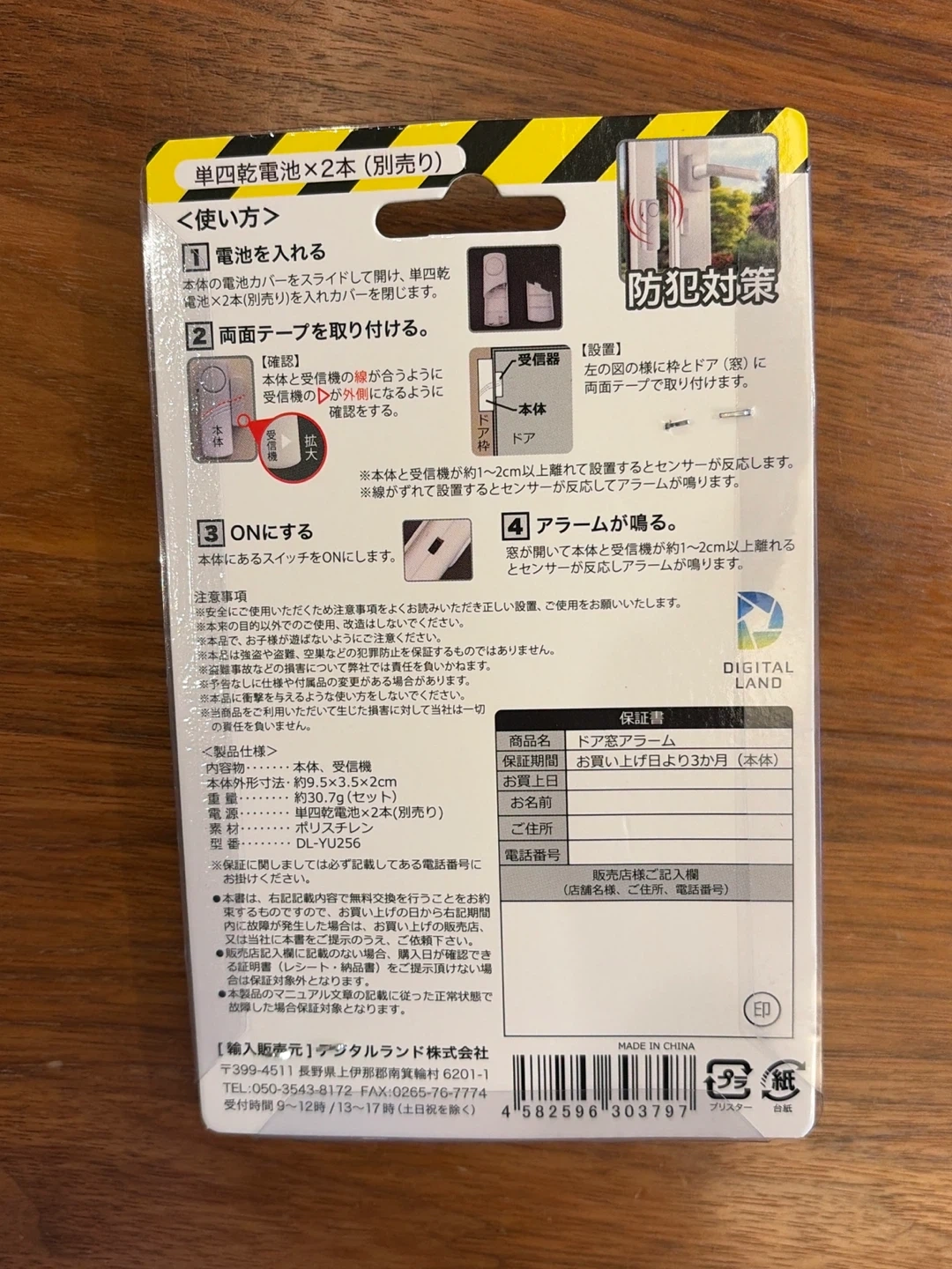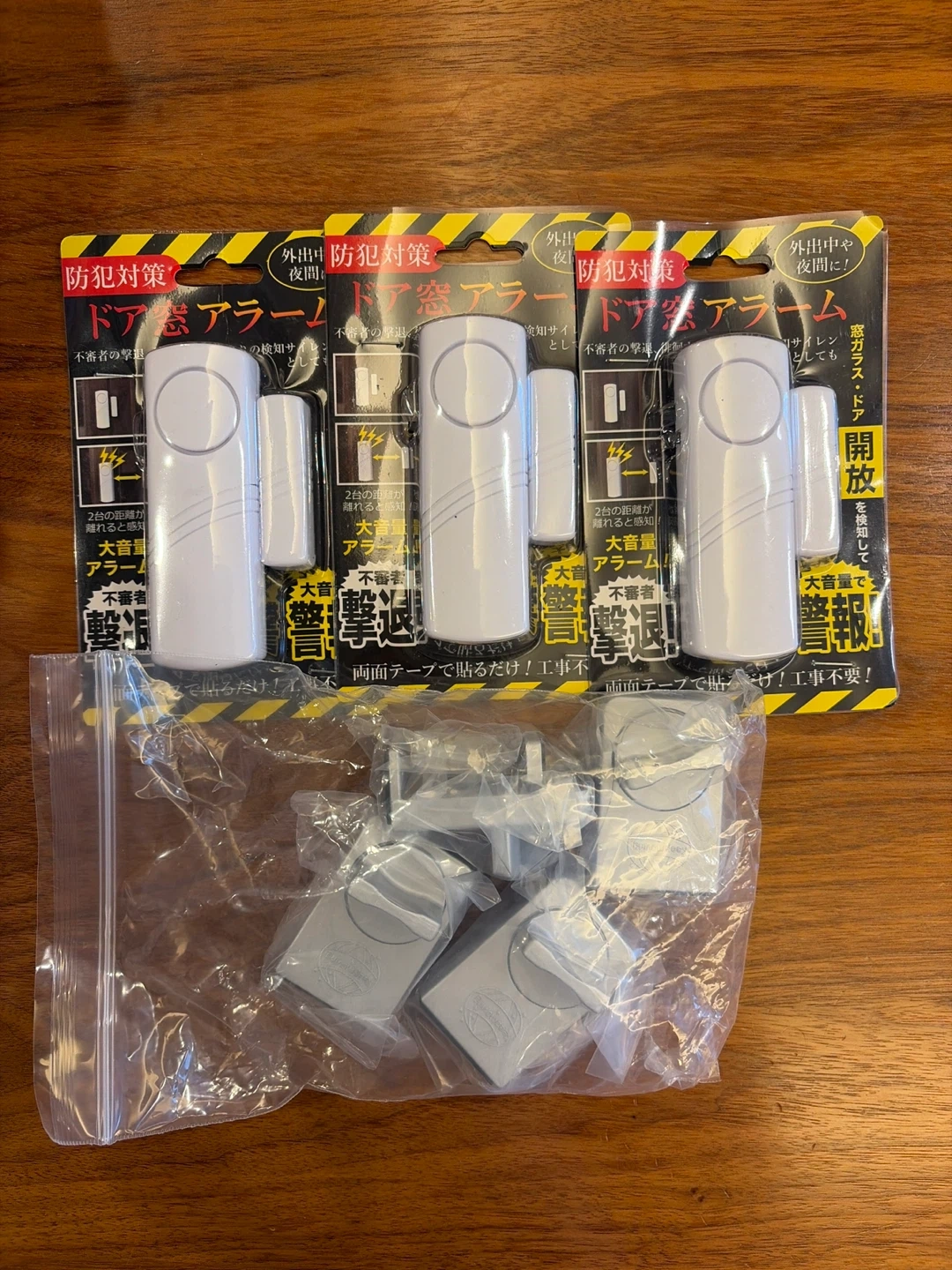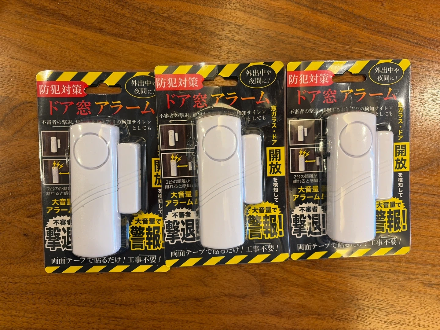 ★ドア窓用の防犯アラーム 定価:2,019円(3つ、Amazon) 【大音量アラーム搭載】本体と受信機にわかれていて、その2台の距離が離れるとドアの開放を検知し、アラームが鳴る仕組みになっています。本体と受信機が約1〜2m以上離れるとセンサーが反応し、アラームが鳴ります。不審者の撃退用に。防犯グッズとして。お年寄りの徘徊の検知サイレンとしても◎ 【取付簡単】付属の両面テープで貼るだけなので、工事不要!乾電池式なので、電源の場所や配線を問わず設置できます。本体にスイッチがついているので、使用しないときは電源をオフにすることもできます。 【使い方】1.電池を入れる本体のカバーをスライドして開け、単4乾電池×2(別売り)を入れカバーを閉じます。2.両面テープを取り付けるドア枠と窓に両面テープで取り付けます。取付の際には受信機と本体の線が合うように取り付けてください。3.電源をONにする本体にあるスイッチをONにします。※本体と受信機が約1~2cm以上離れて設置するとセンサーが反応します。※線がずれて設置するとセンサーが反応してアラームが鳴ります。 【様々な場所に】外出中や夜間の防犯に。長期の不在中にもオススメです。自宅のドアや窓、ガレージ、倉庫、納屋などに。 【仕様】内容物:本体、受信機本体外寸:約9.5×3.5×2cm電源:単4電池×2本(別売り) 必要あれば電池もおつけします。 ★ ギブアップ シルバー ブリスターパック 窓用補助錠 防犯 4個入 定価:2,928円(4つ、Amazon) 窓のレールに差し込み、ツマミを回すだけの簡単取付。誰でもすぐに使えて、しっかり防犯!引き違い窓に対応し、工具不要・取り外し自由。空き巣対策にも、ちょい開け換気にもぴったり。面倒な鍵いらずで、ピタッと安心! 商品仕様 カラー:シルバー 内容量:4個) 材質:本体:亜鉛ダイカスト 押板:天然ゴム